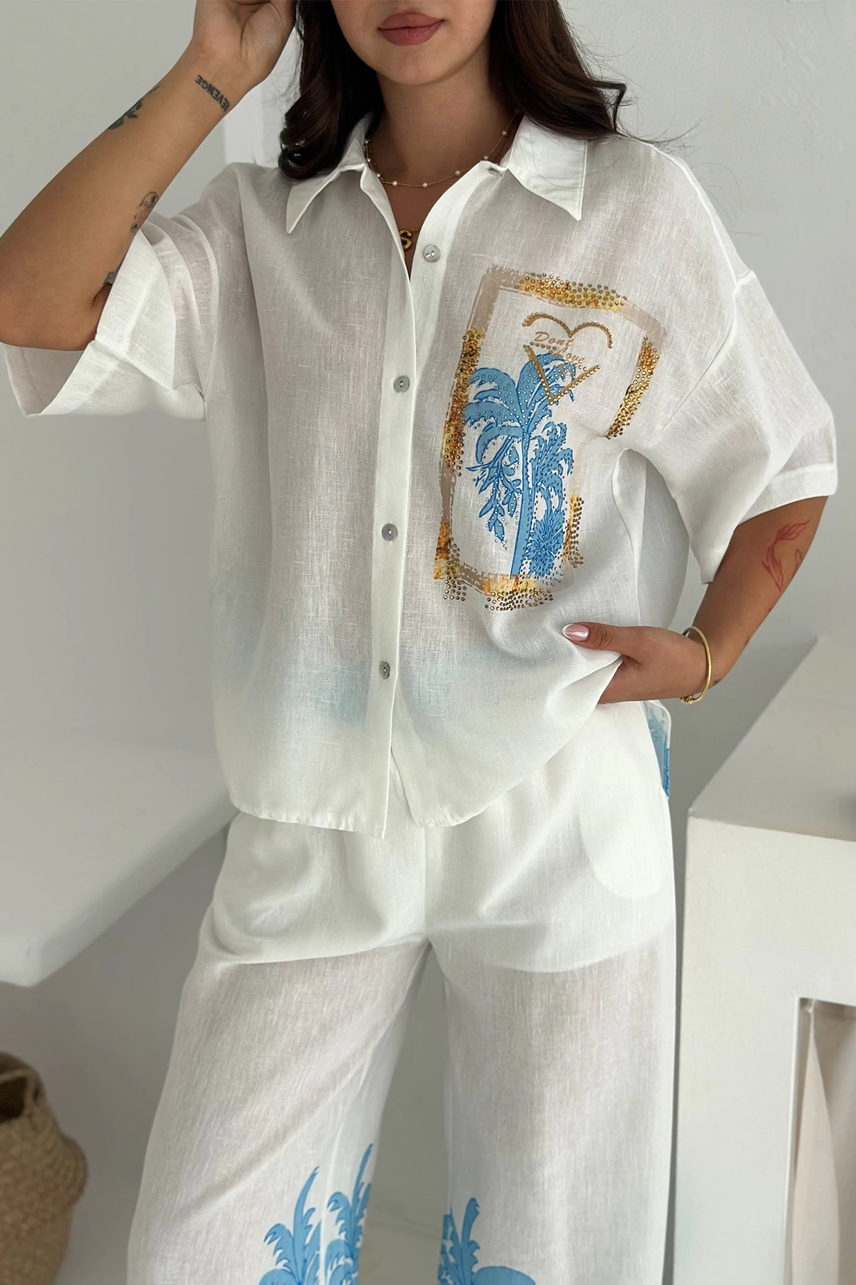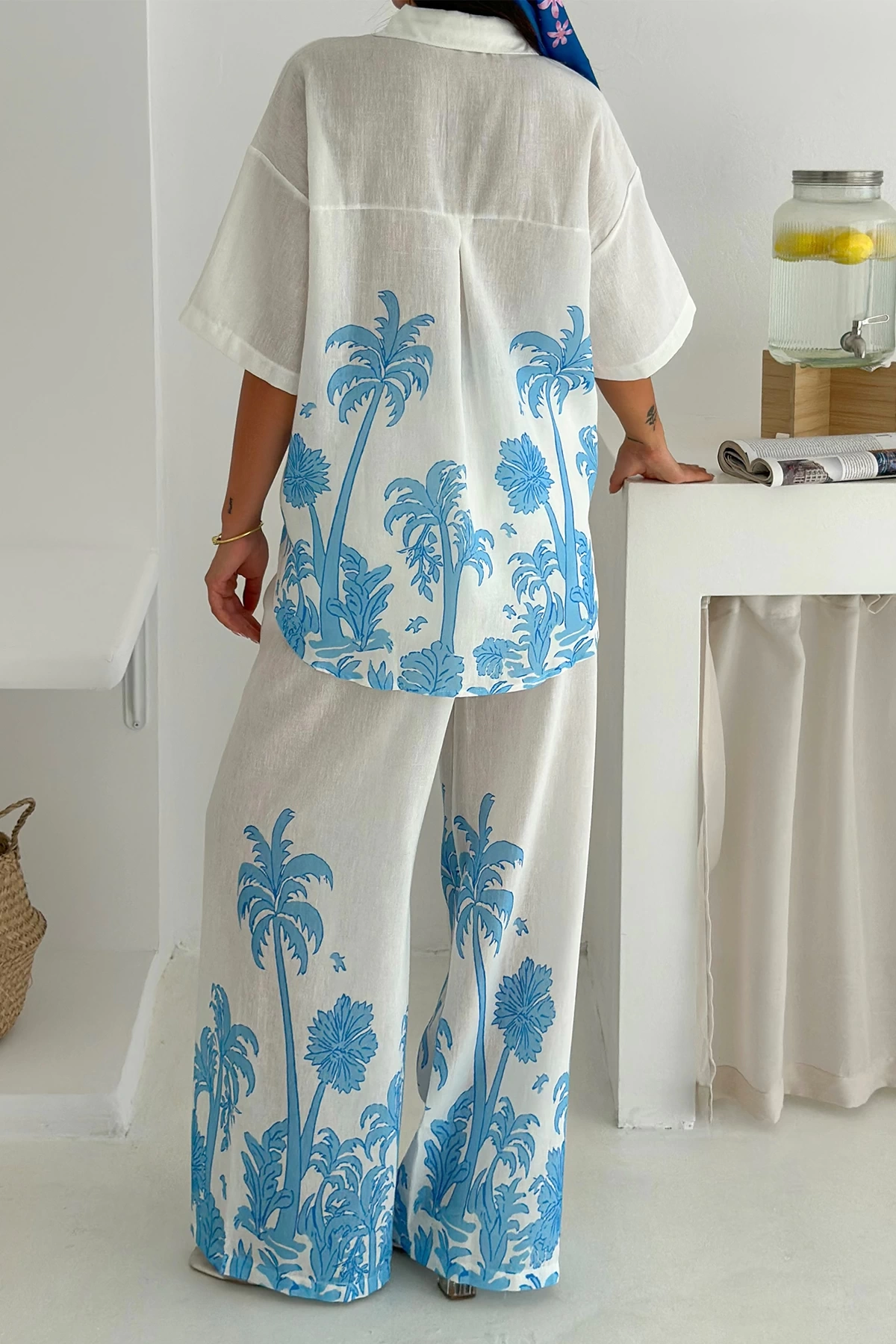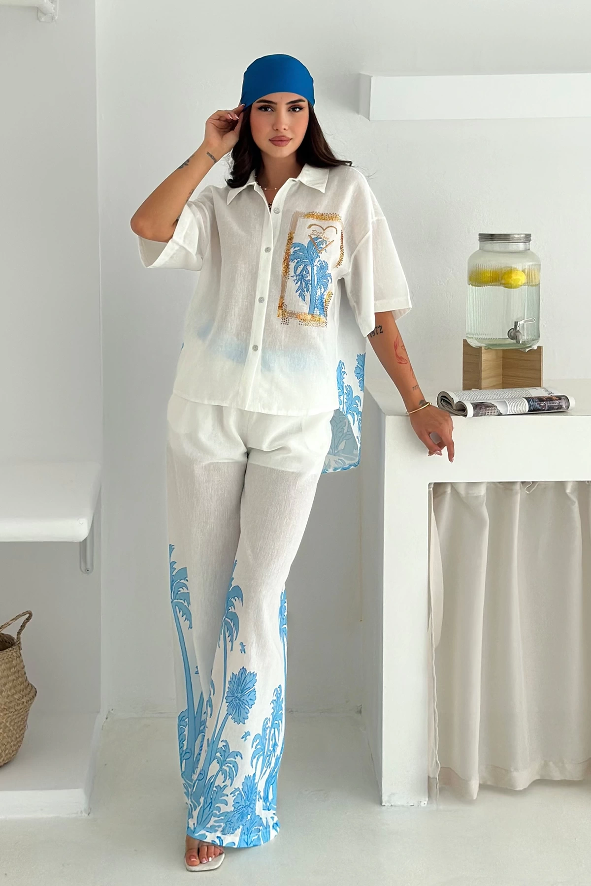 Keten Kumaş Palmiye Baskılı Cep Taş Detaylı Takım Mavi