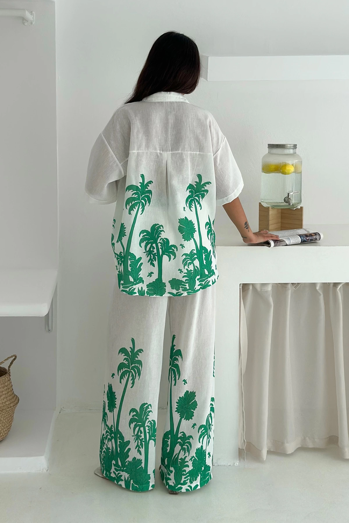 Keten Kumaş Palmiye Baskılı Cep Taş Detaylı Takım Yeşil