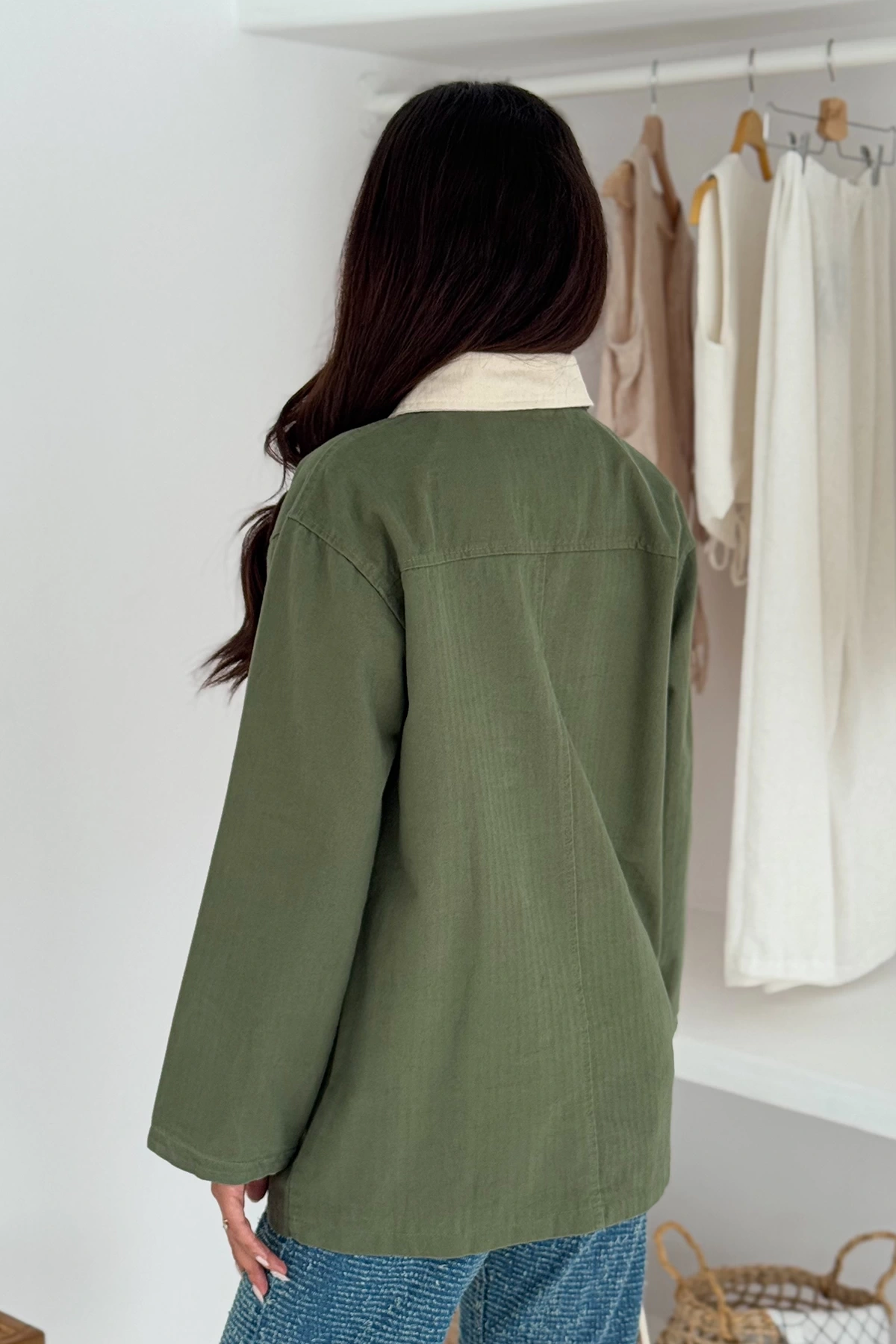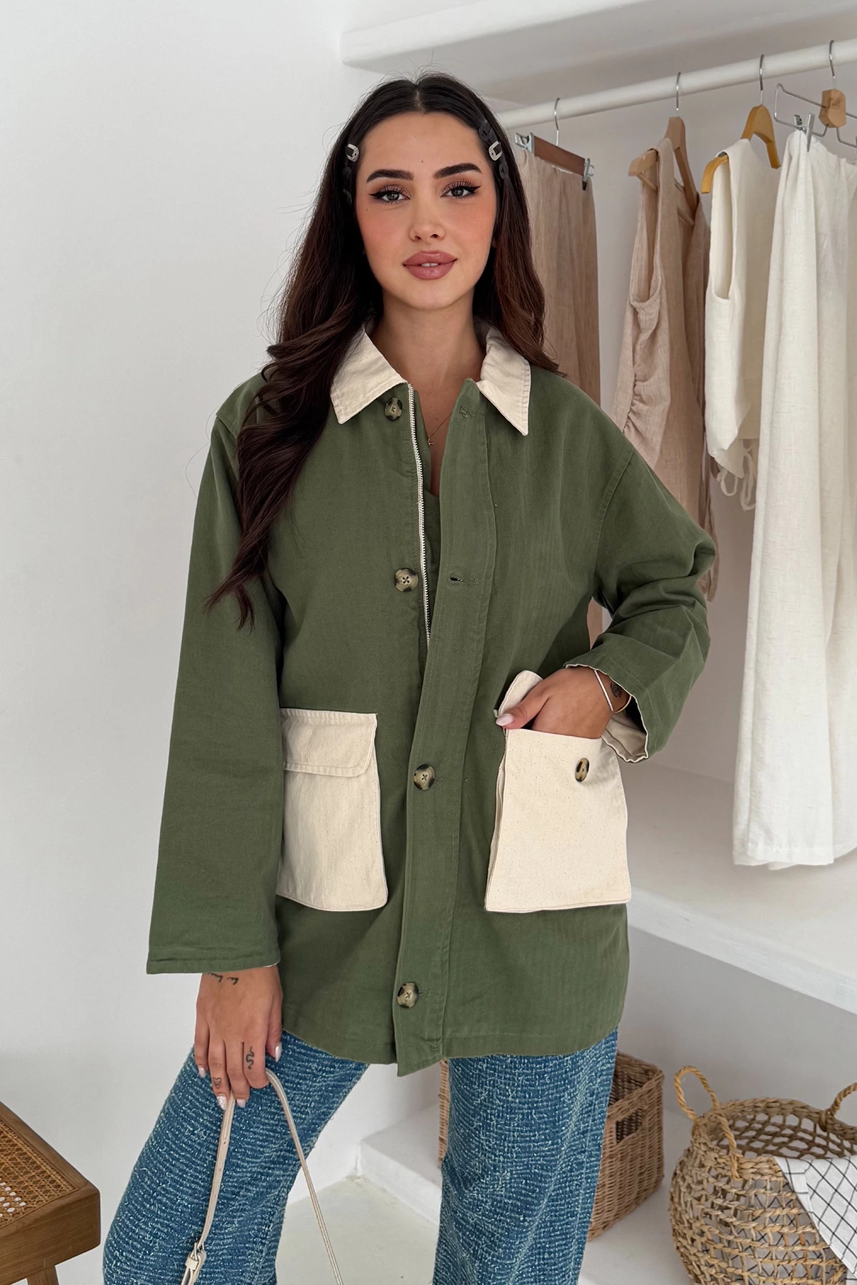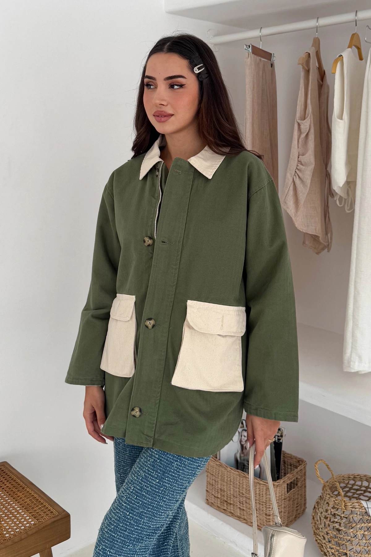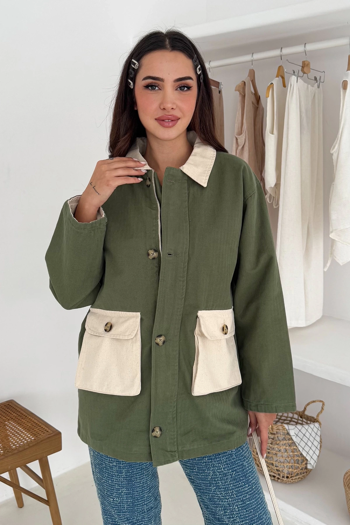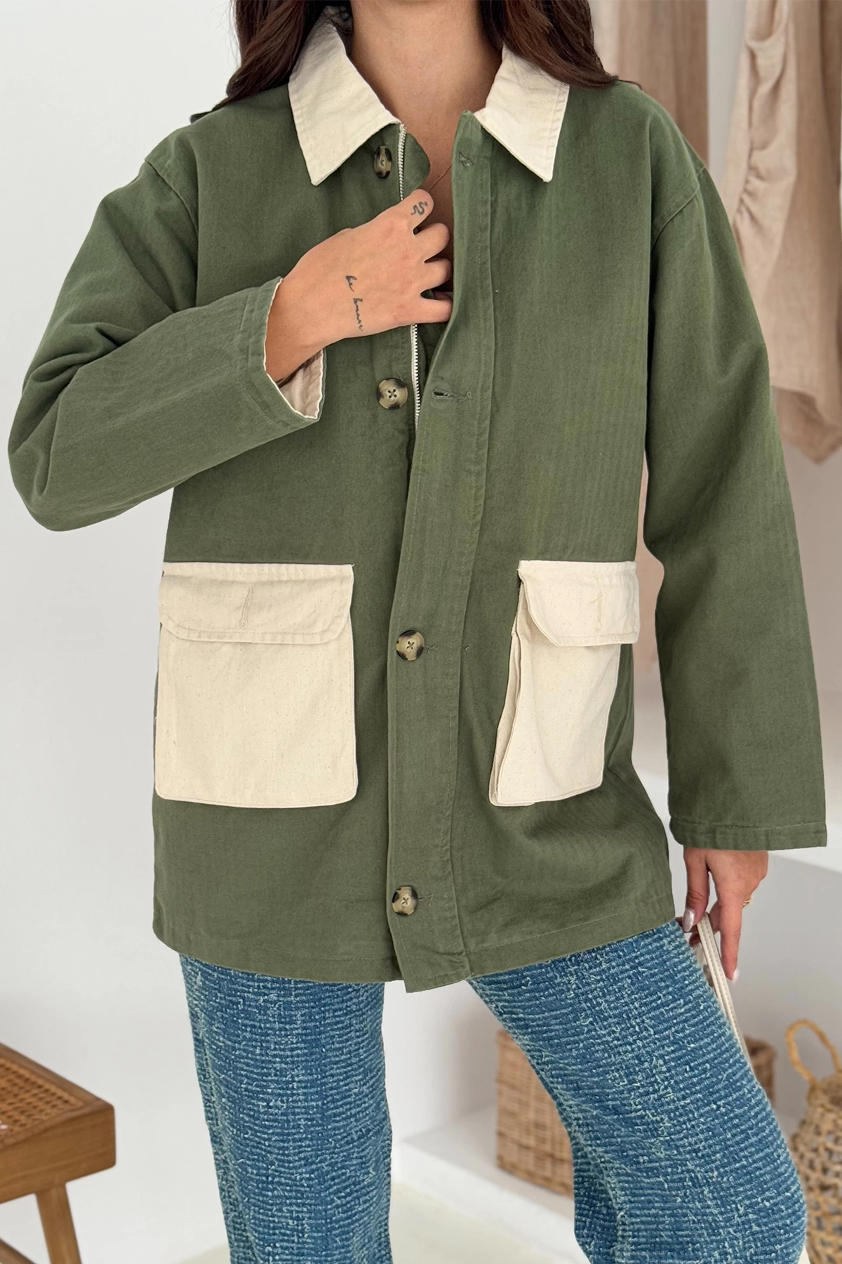 Körüklü Cep Detaylı Yağmur Gabardin Ceket Yeşil