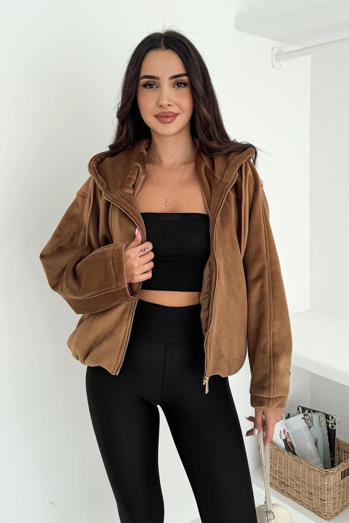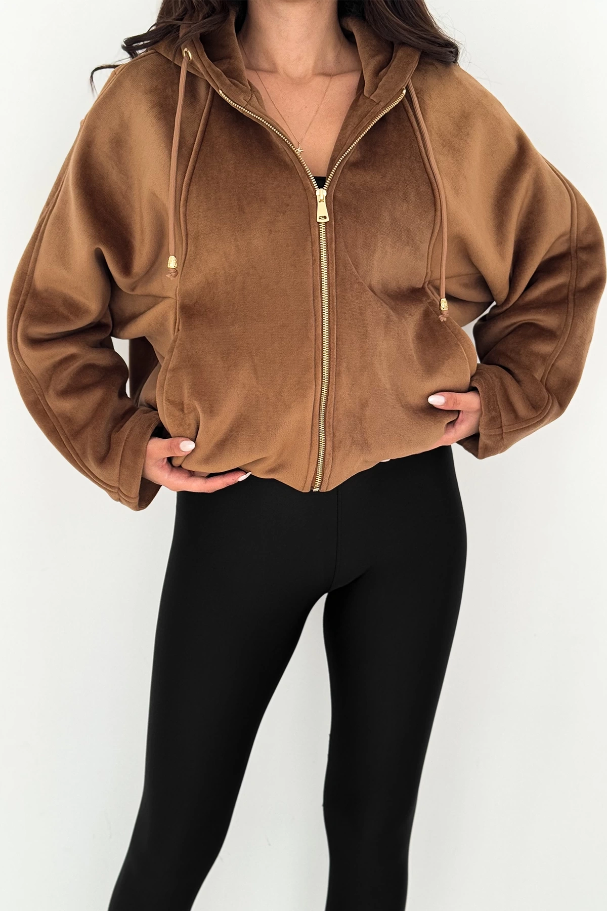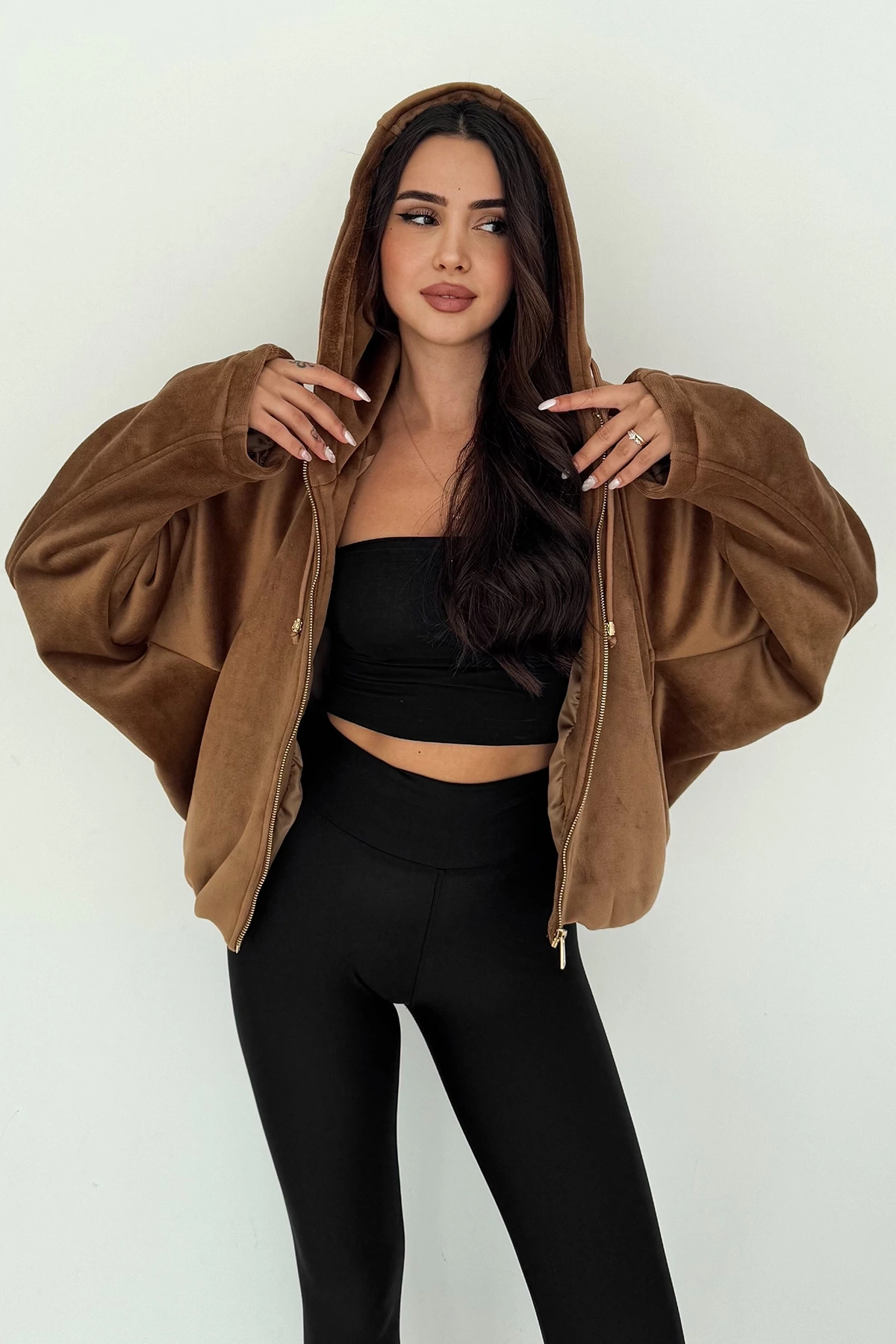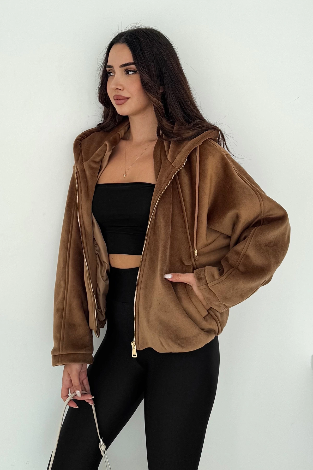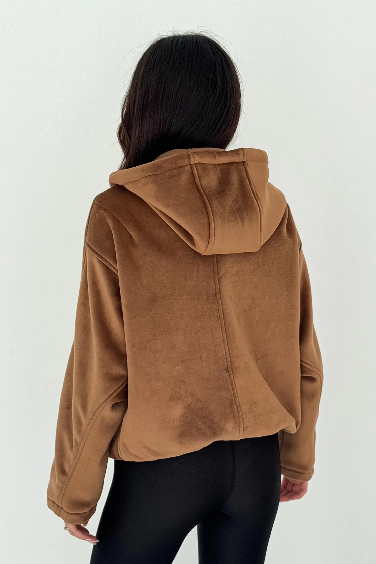 Kürk Kumaş Kapşonlu Mont Kahverengi