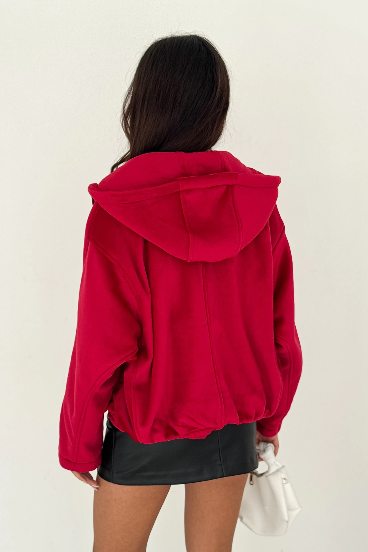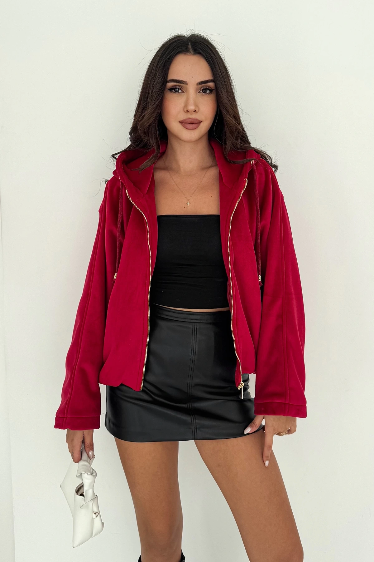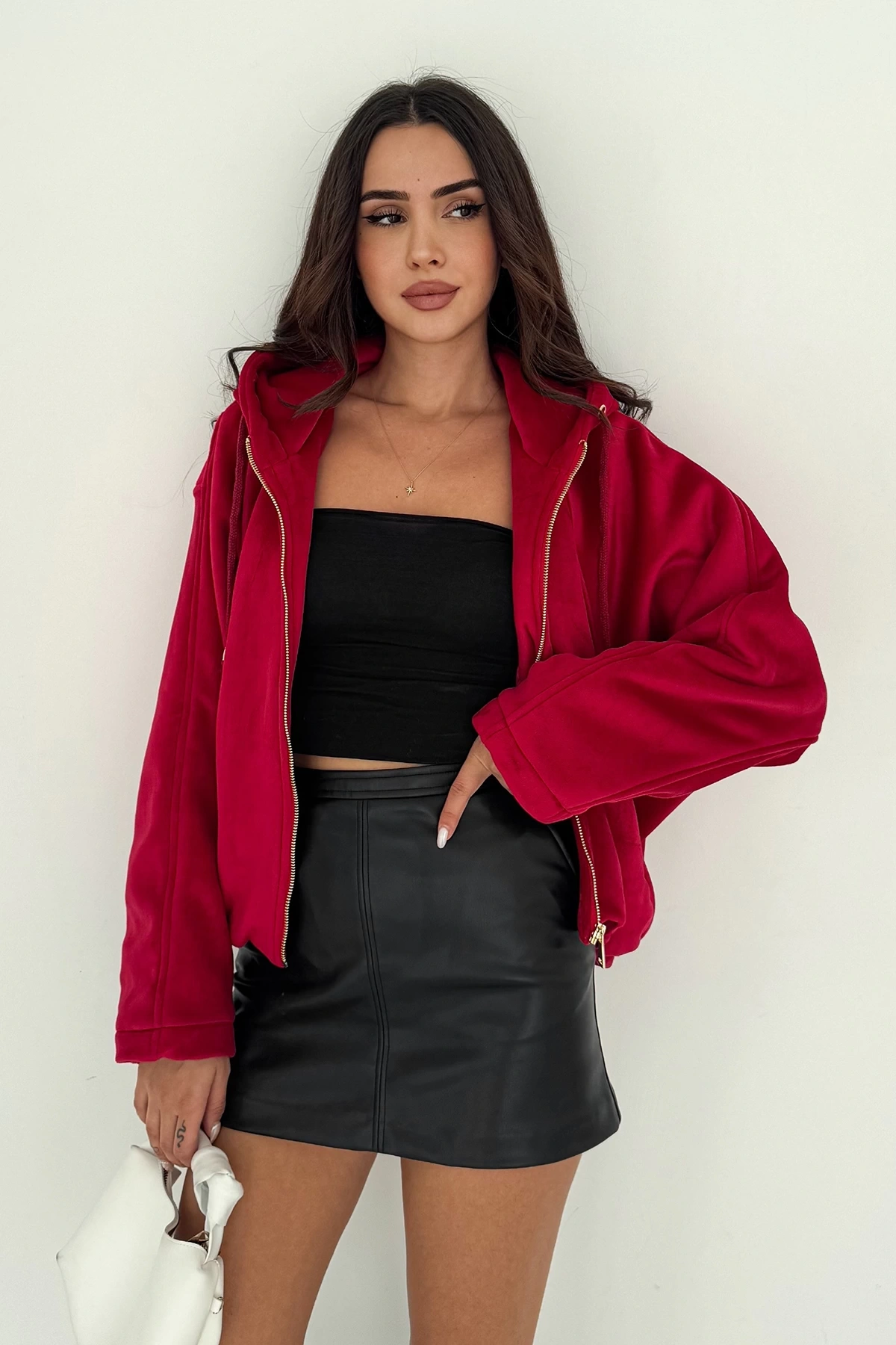 Kürk Kumaş Kapşonlu Mont Kırmızı