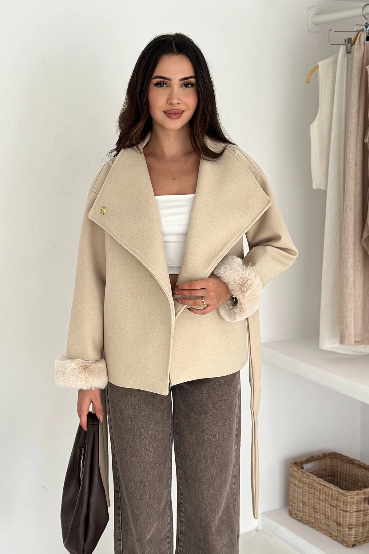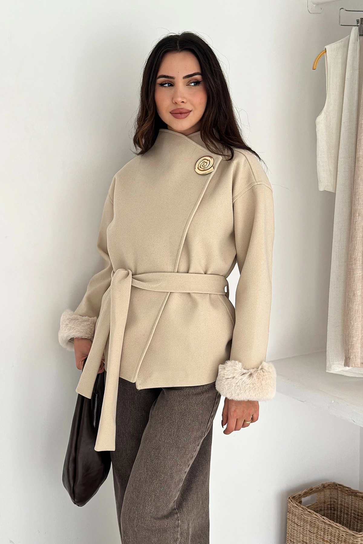 Broşlu Kürk Detaylı Kaşe Kaban Krem