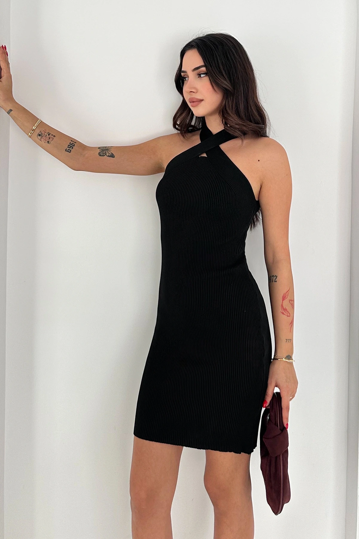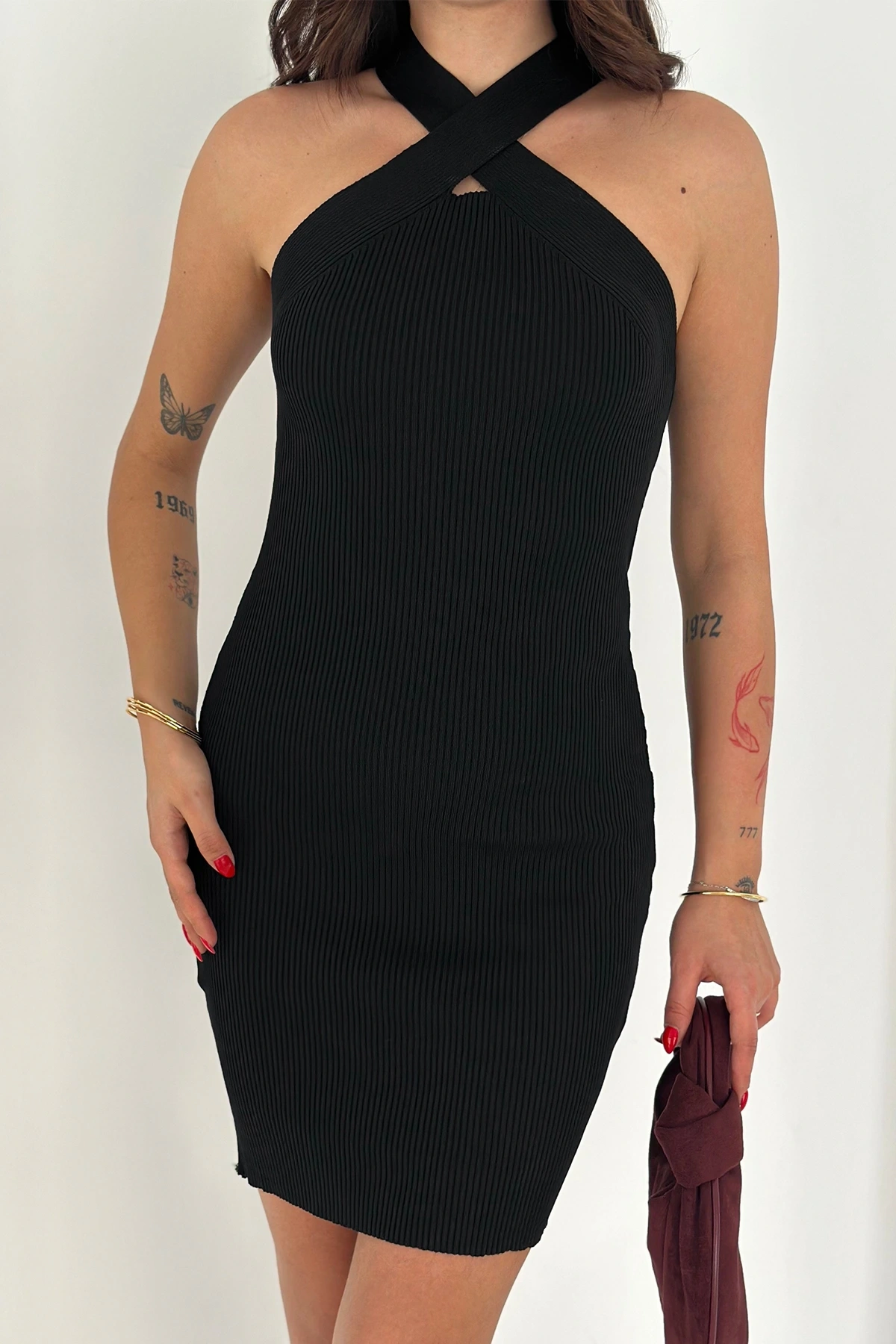 Çapraz Yaka Triko Elbise Siyah