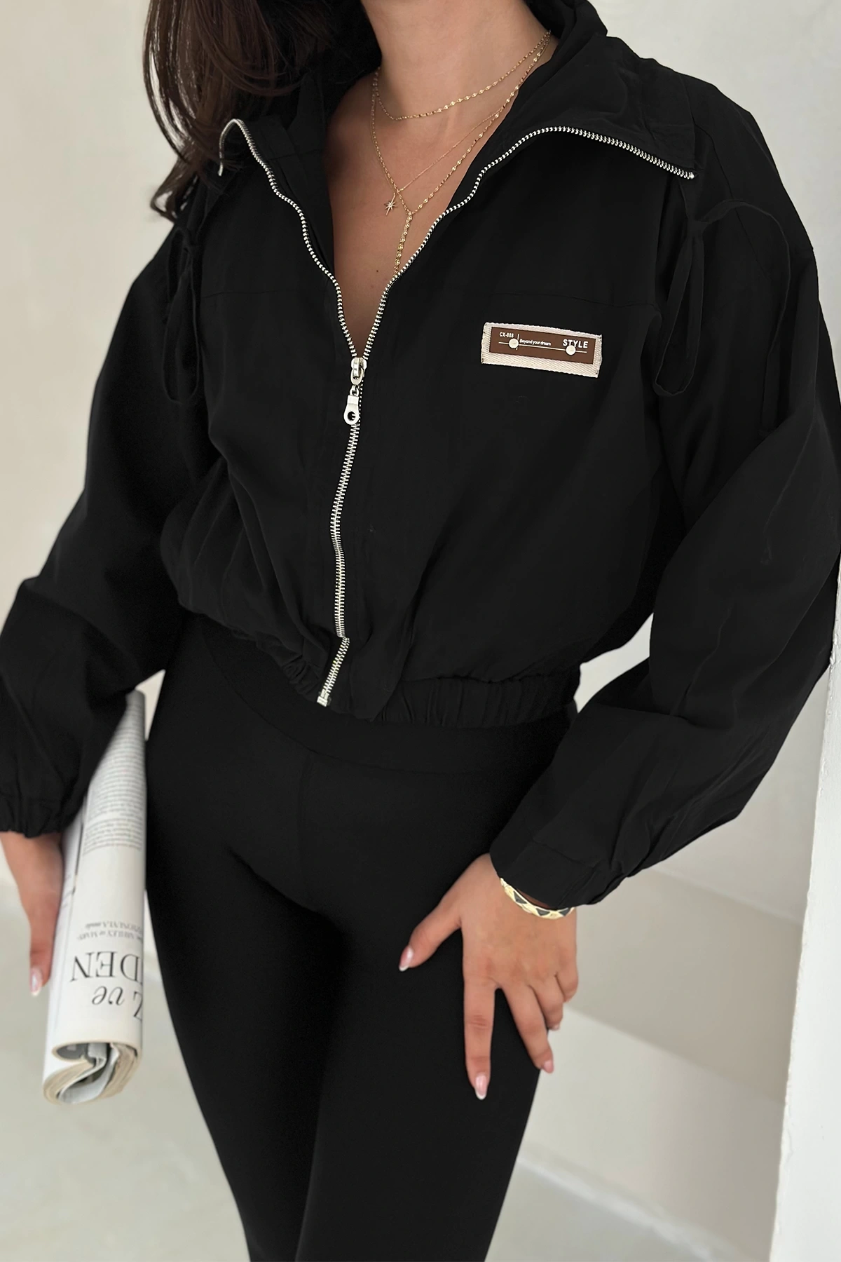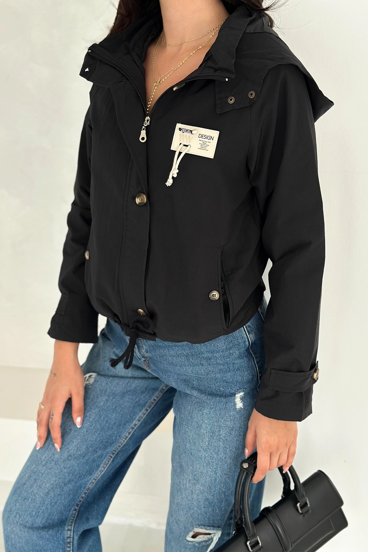 Paraşüt Kumaş Kapüşonlu Mont Siyah