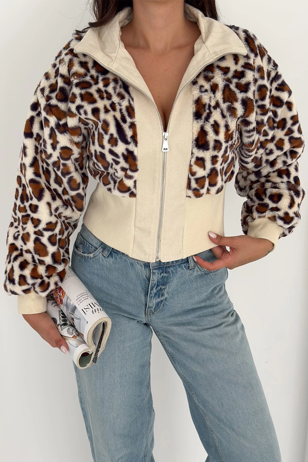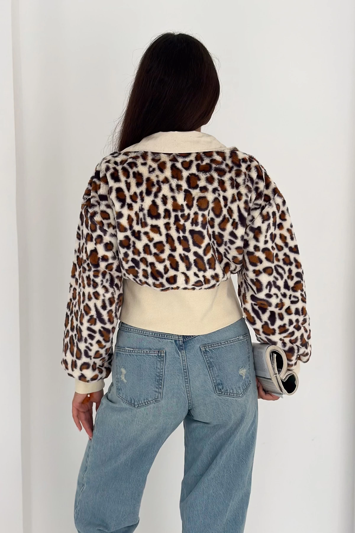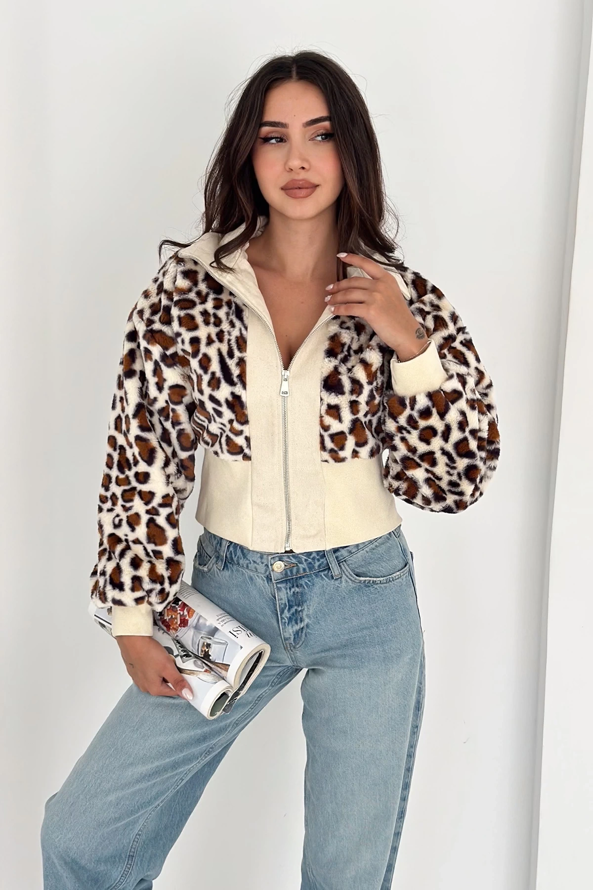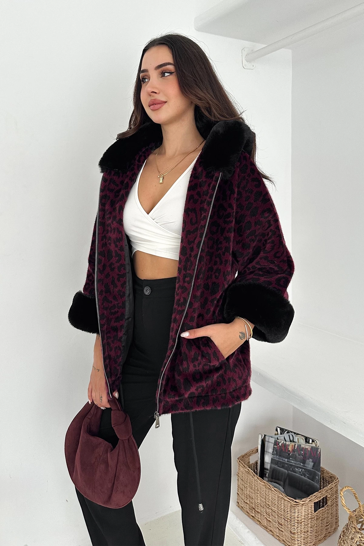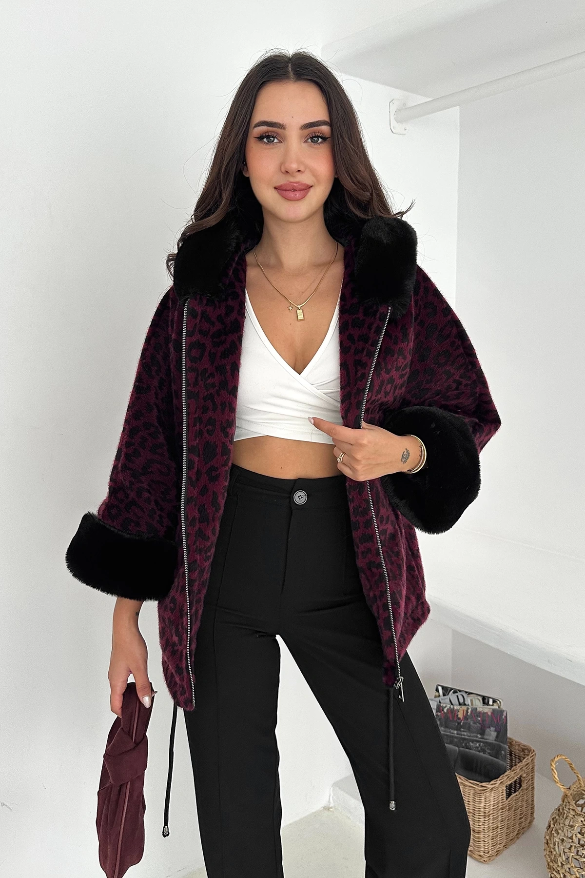 Leopar Desen Kapşonlu Kürk Mont Mor