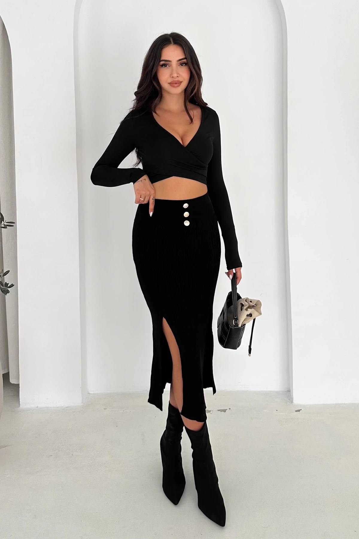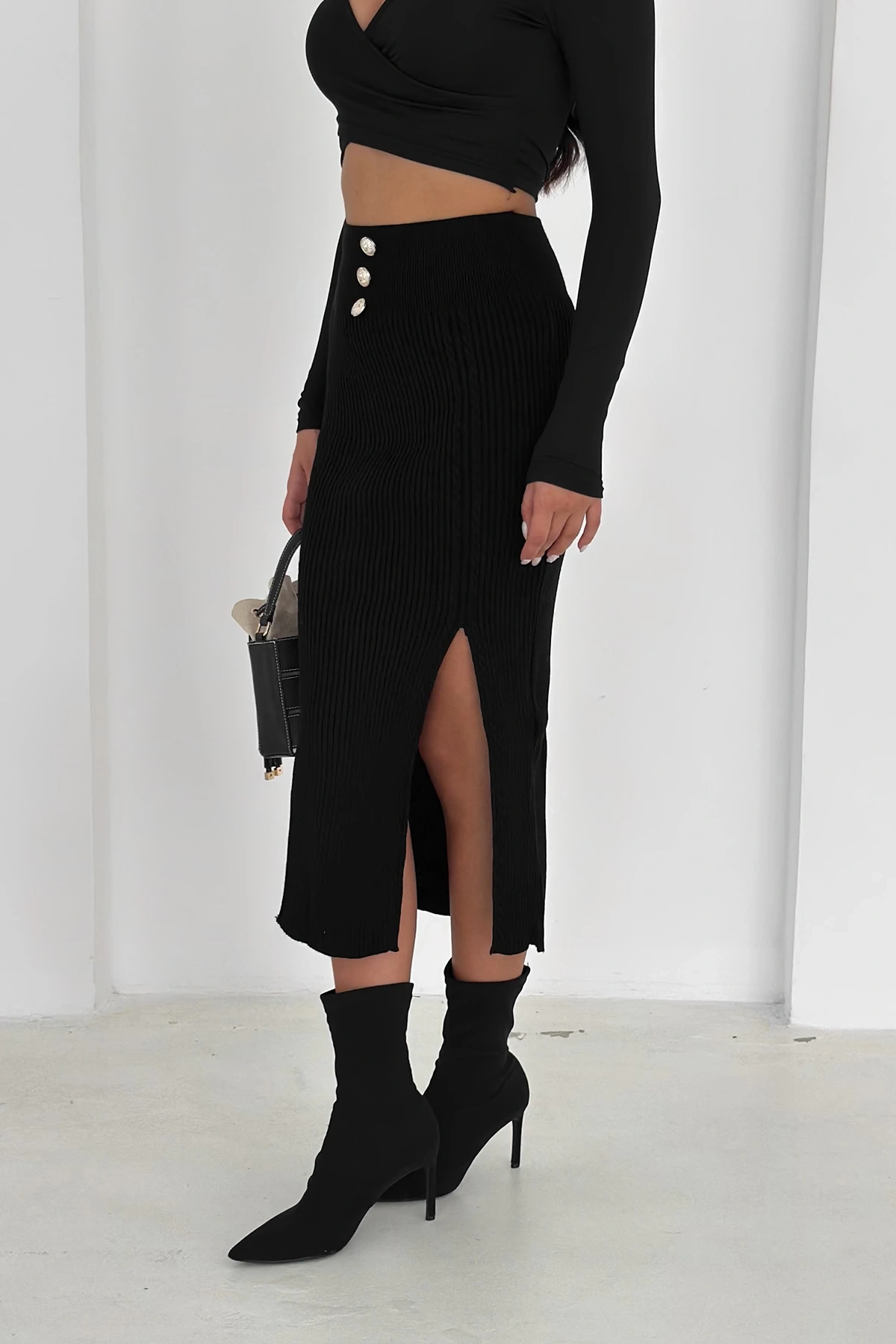 Şıklığı ve rahatlığı bir arada sunan bu siyah triko etek, ön kısmındaki düğme detayları ile modern bir görünüm kazandırır. Yumuşak ve esnek triko kumaşı sayesinde gün boyu konfor sağlar. Hem günlük kombinlerde hem de özel davetlerde şık bir tercih olarak öne çıkar.