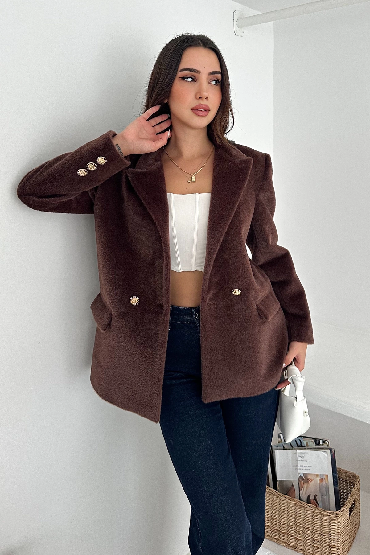 Kuşgözü Detaylı Kaşe Ceket Kahverengi