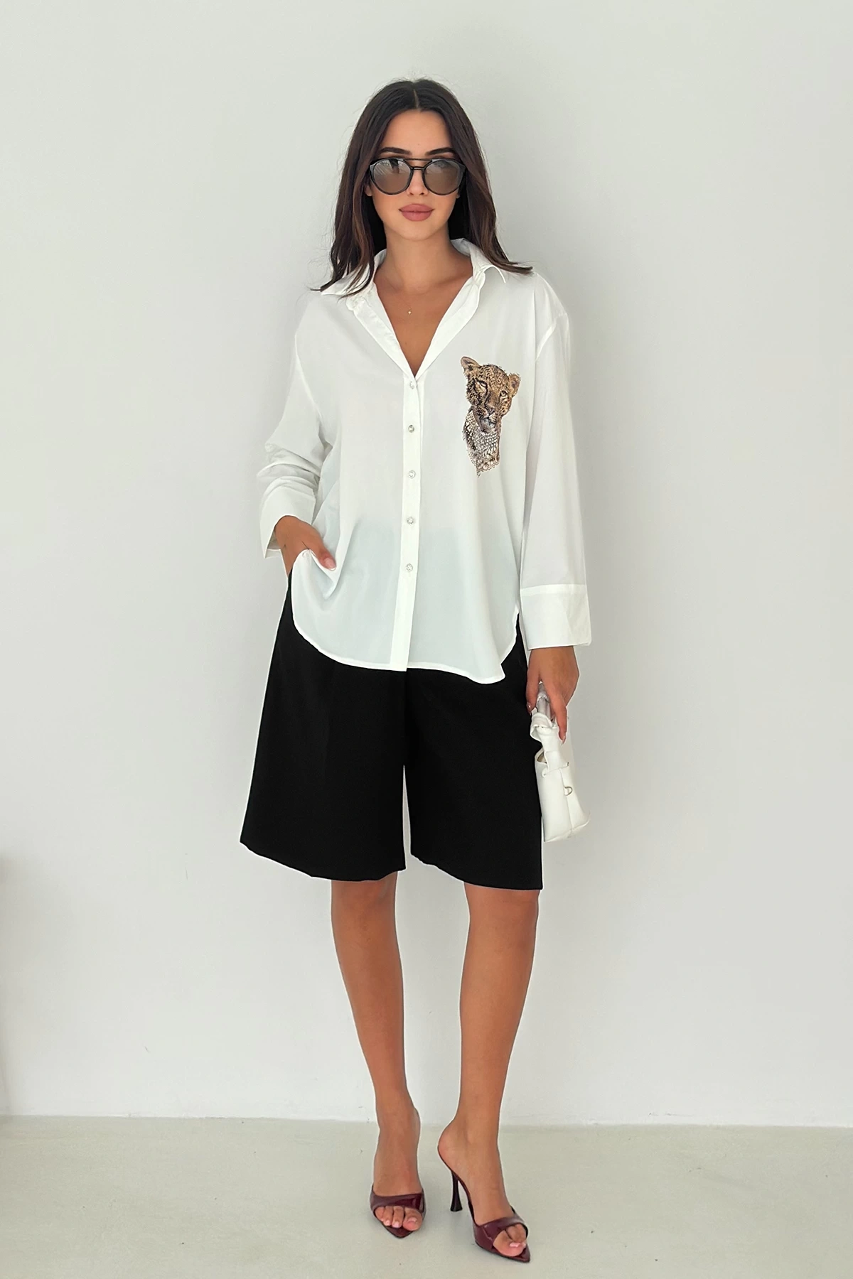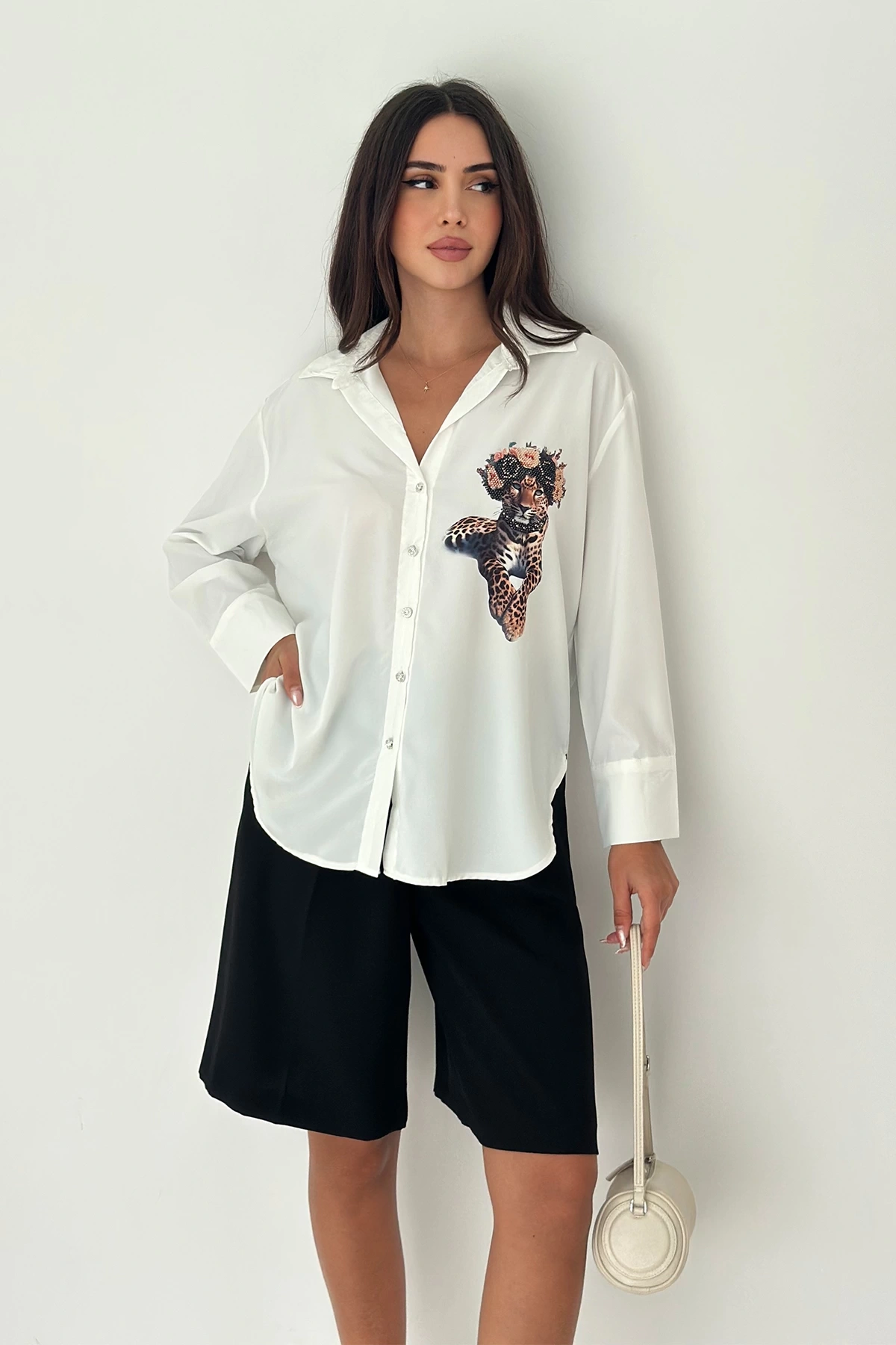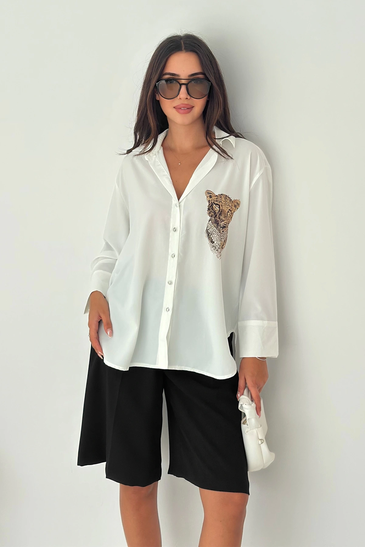 Kaplan Desen Taç Baskılı Taşlı Gömlek