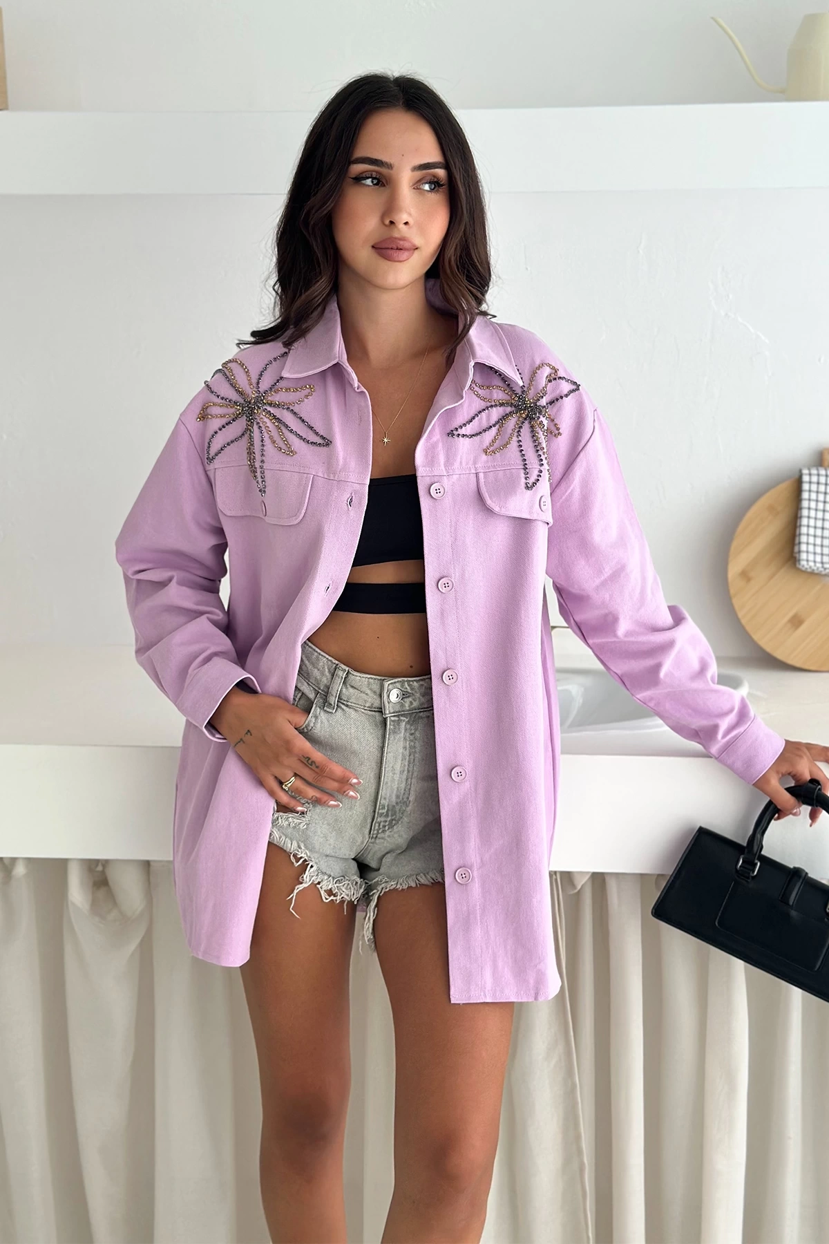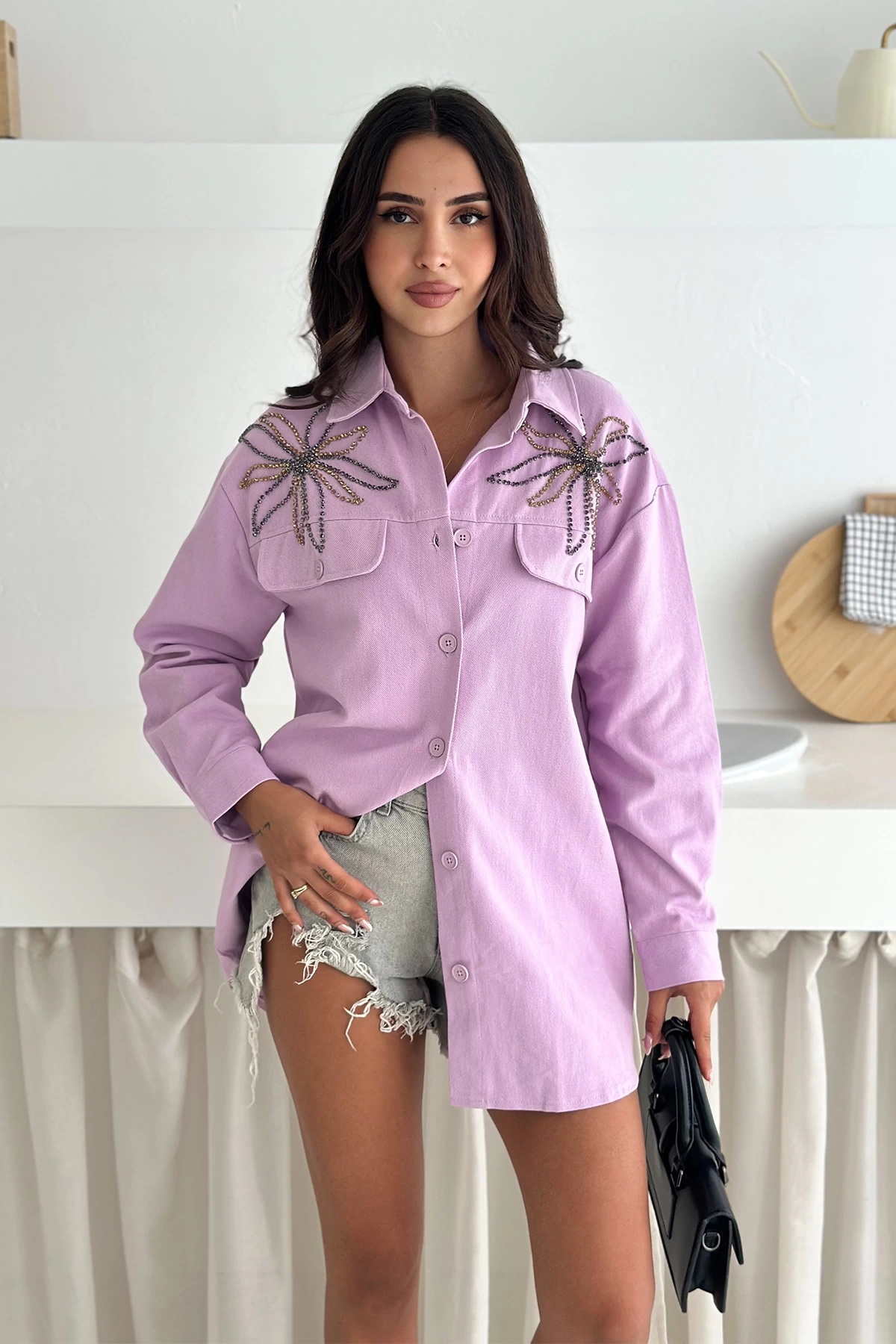 Pembe Aslan Desen Baskılı Taşlı Gömlek