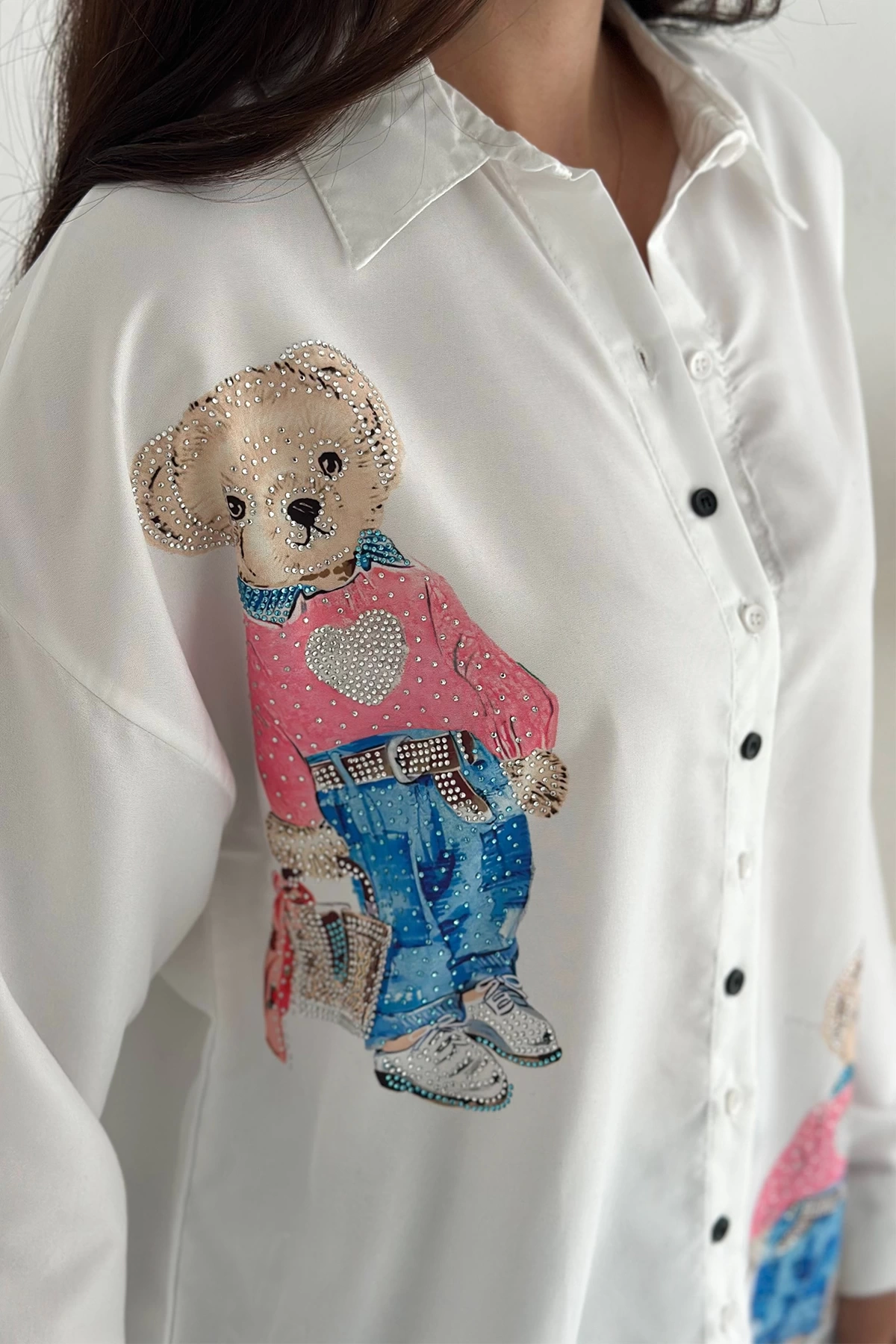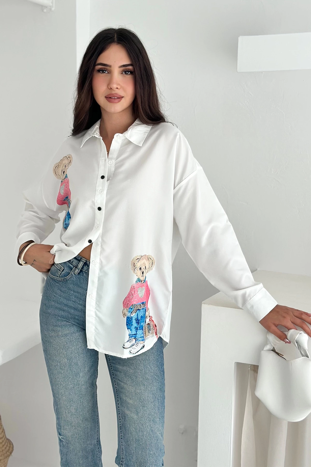 Aslan Desen Baskılı Taşlı Gömlek Gümüş