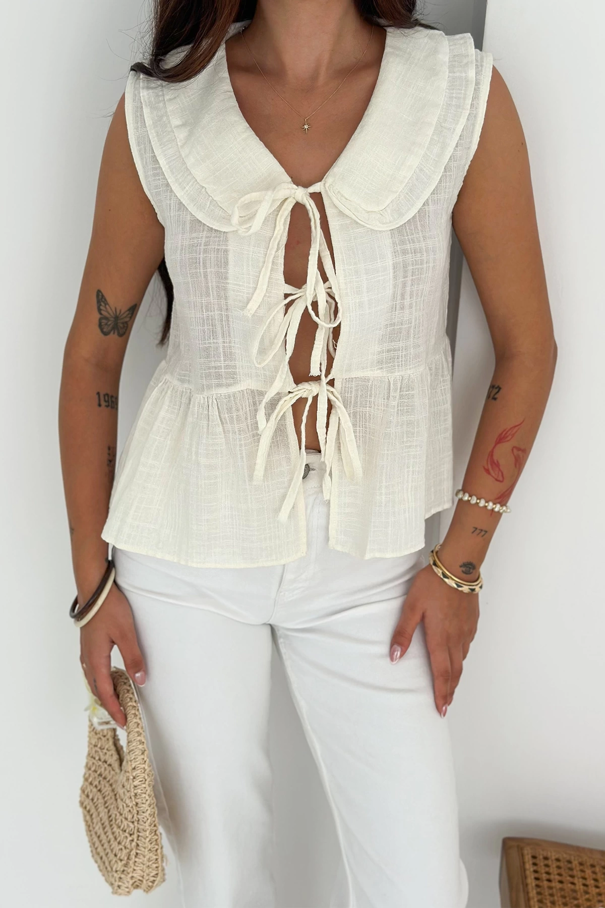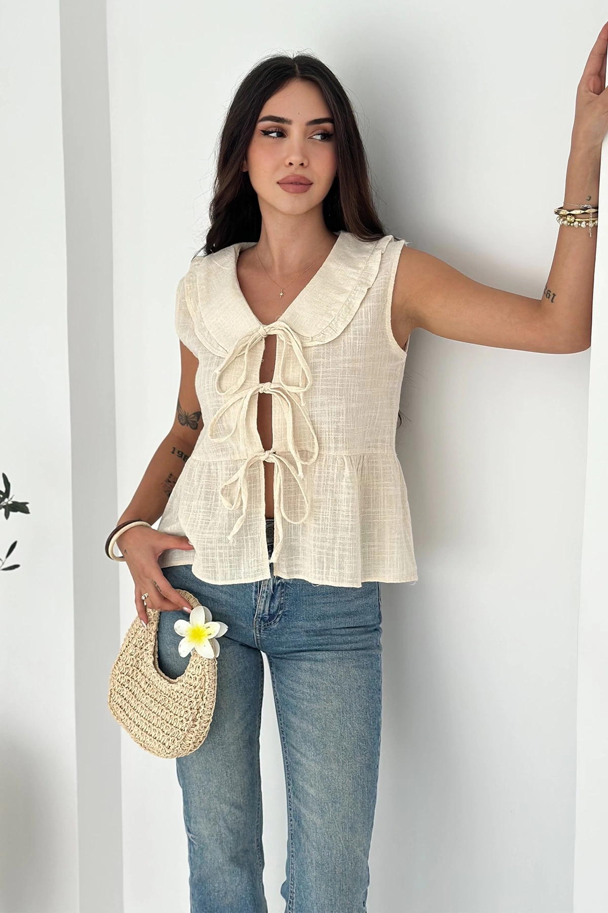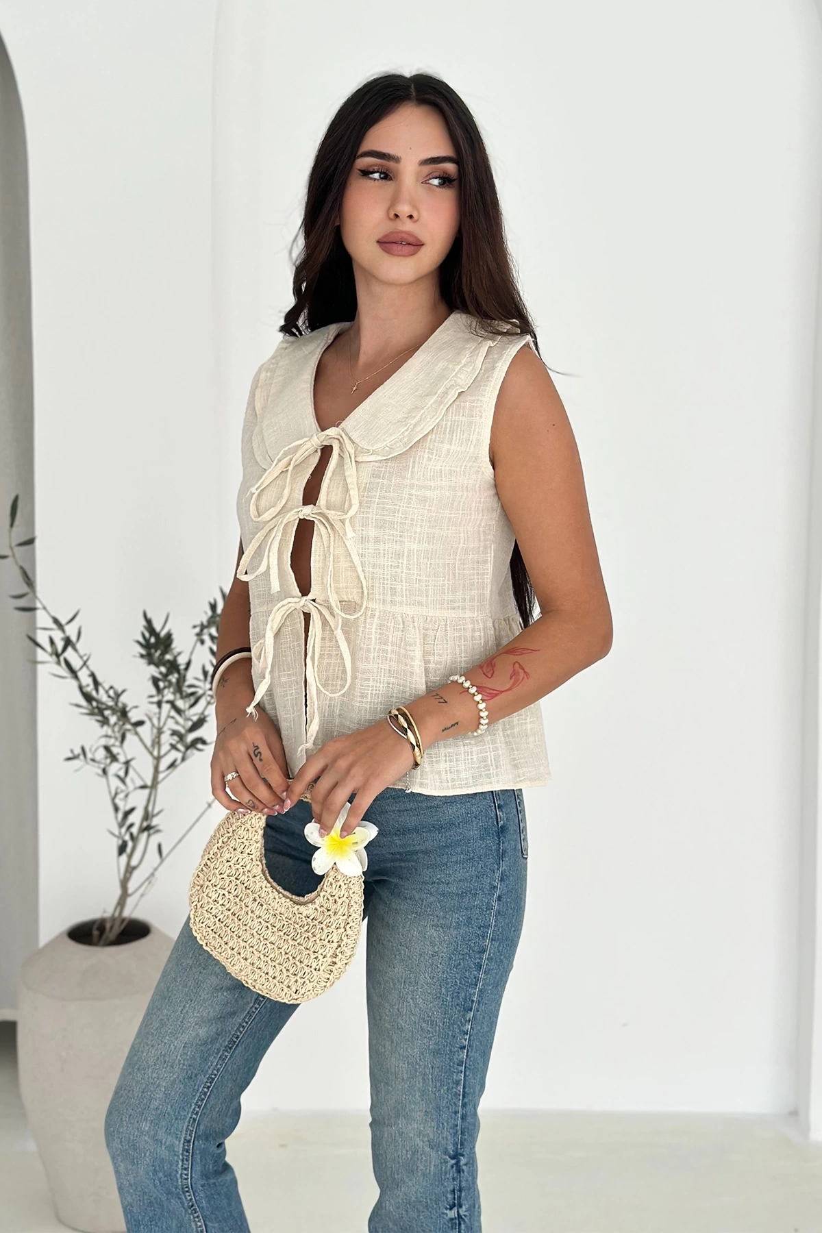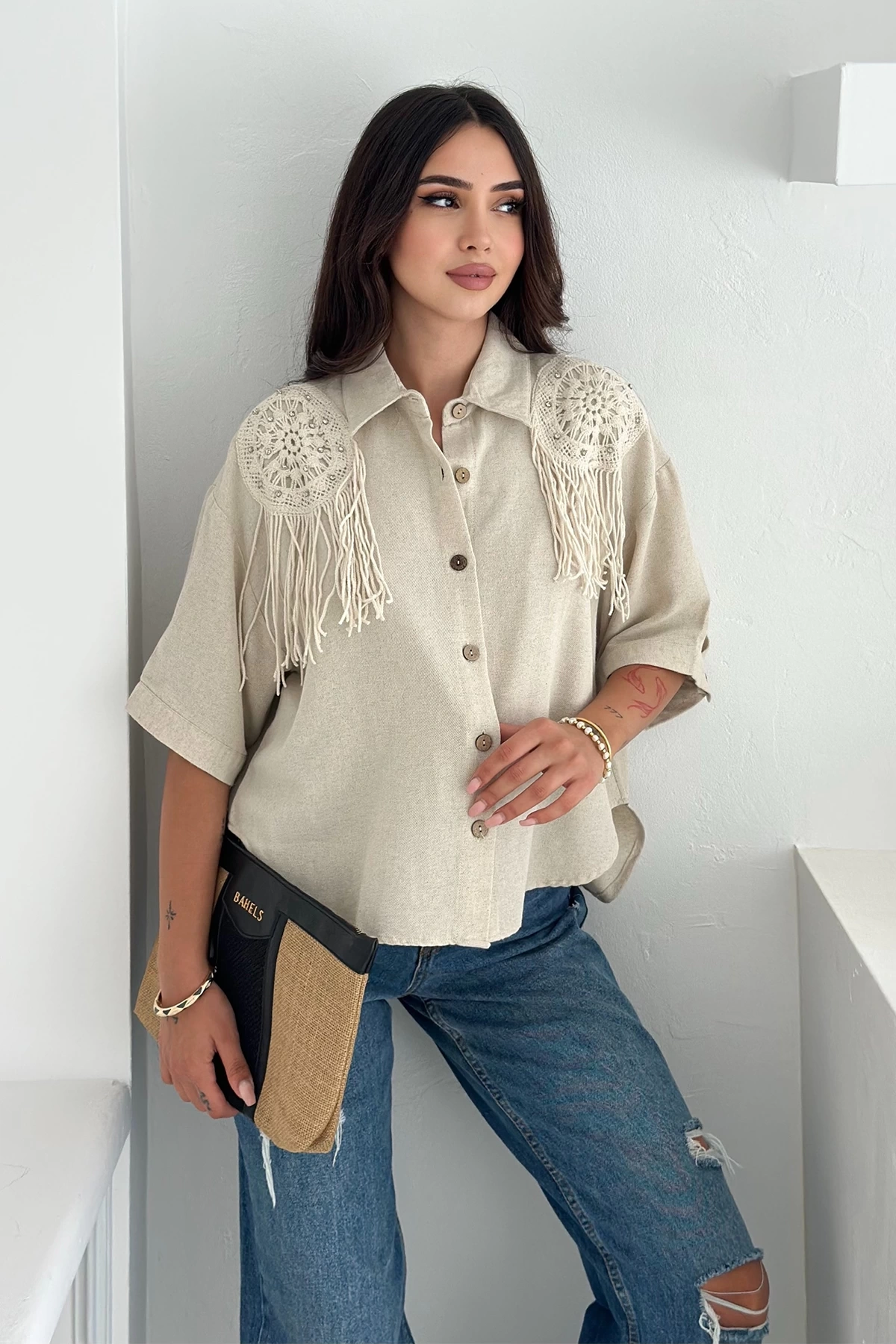 Pamuk Keten File Dantel Detaylı Gömlek Krem