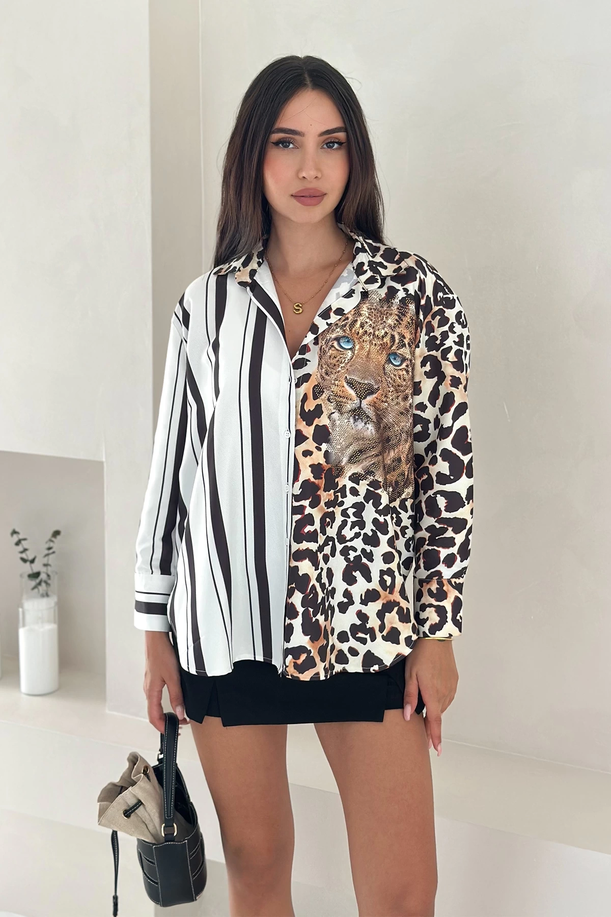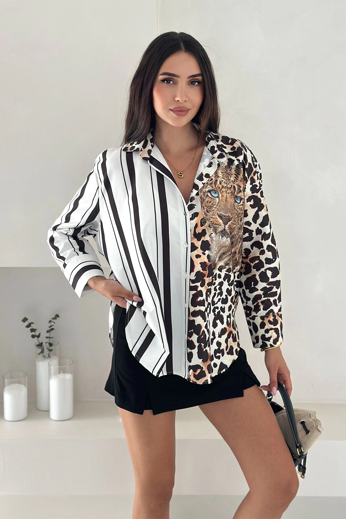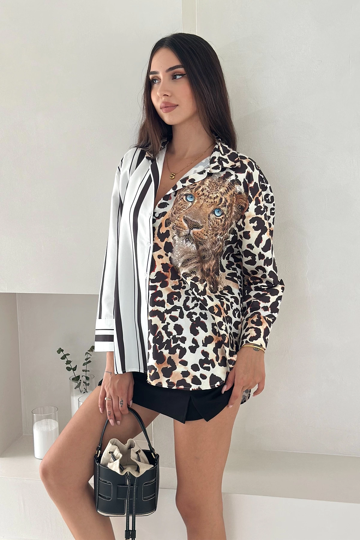 Leopar Taş Baskılı Yarısı Çizgili Gömlek
