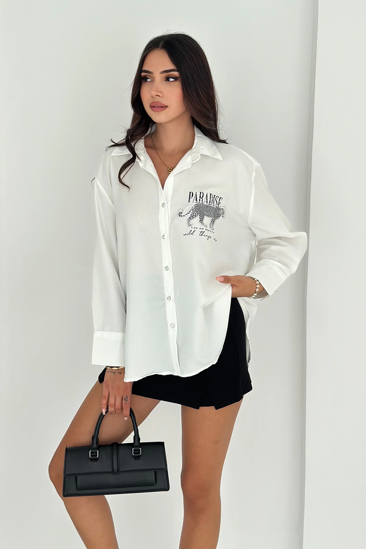 Dril Kumaş Paradise Baskılı Taşlı Gömlek Gümüş