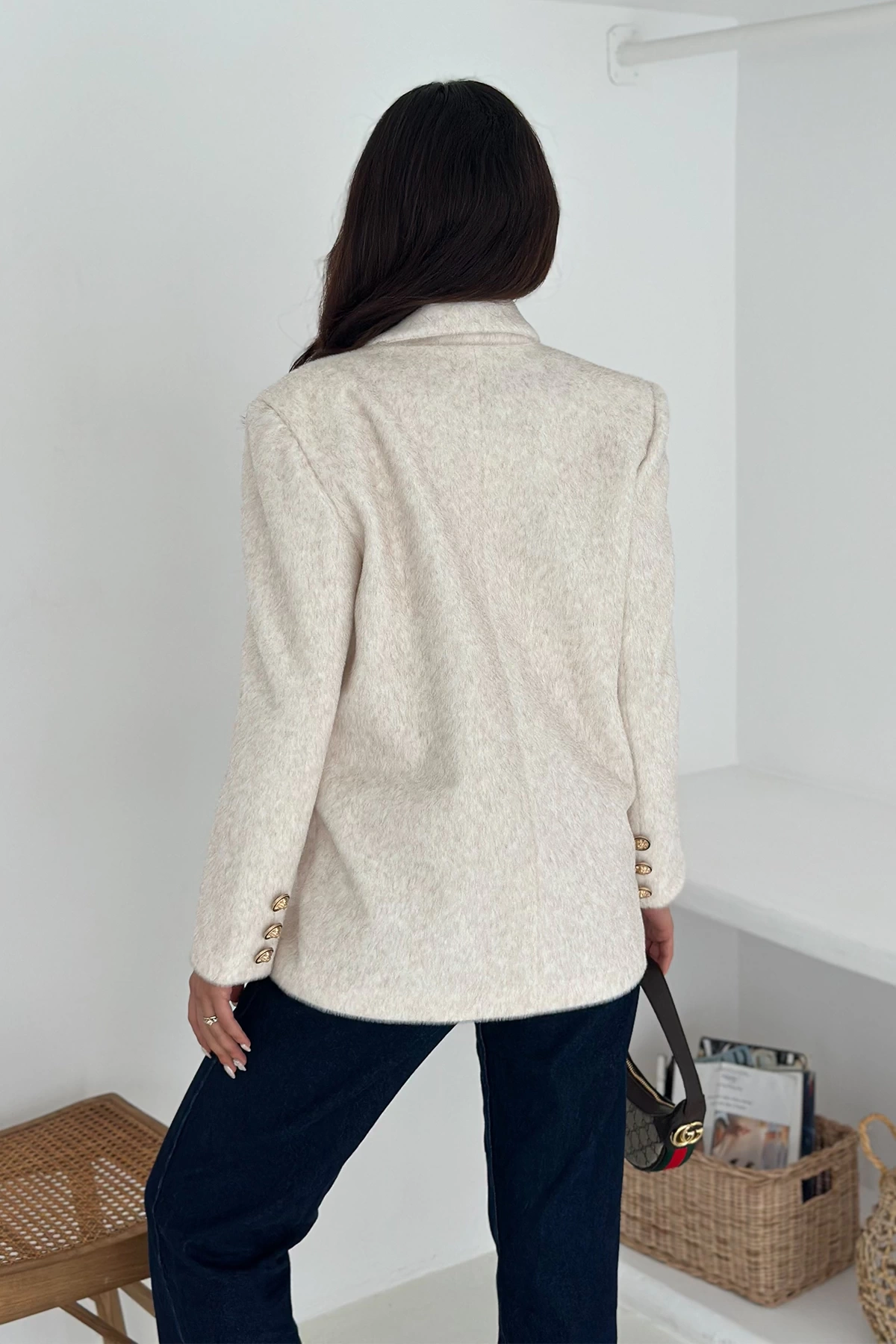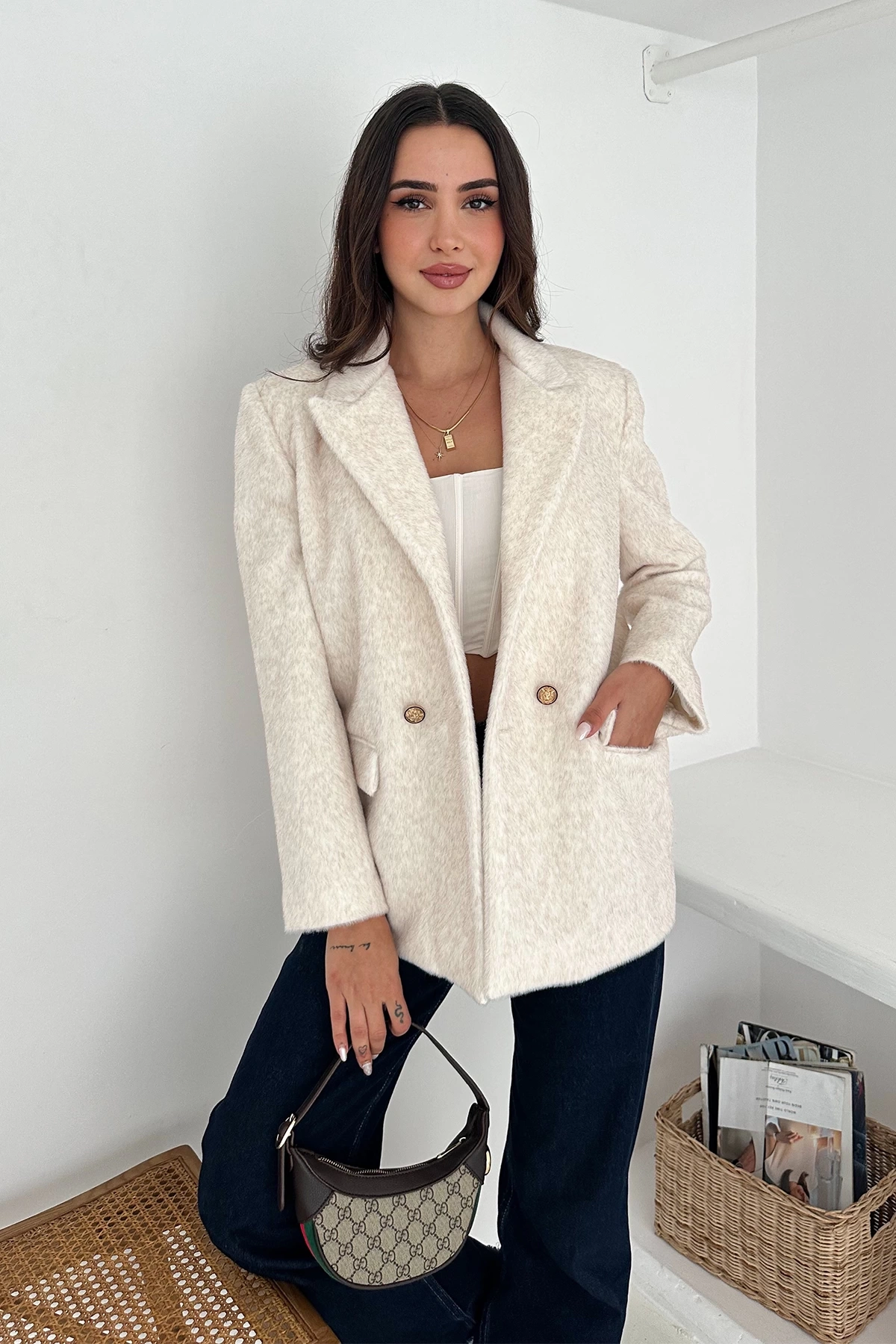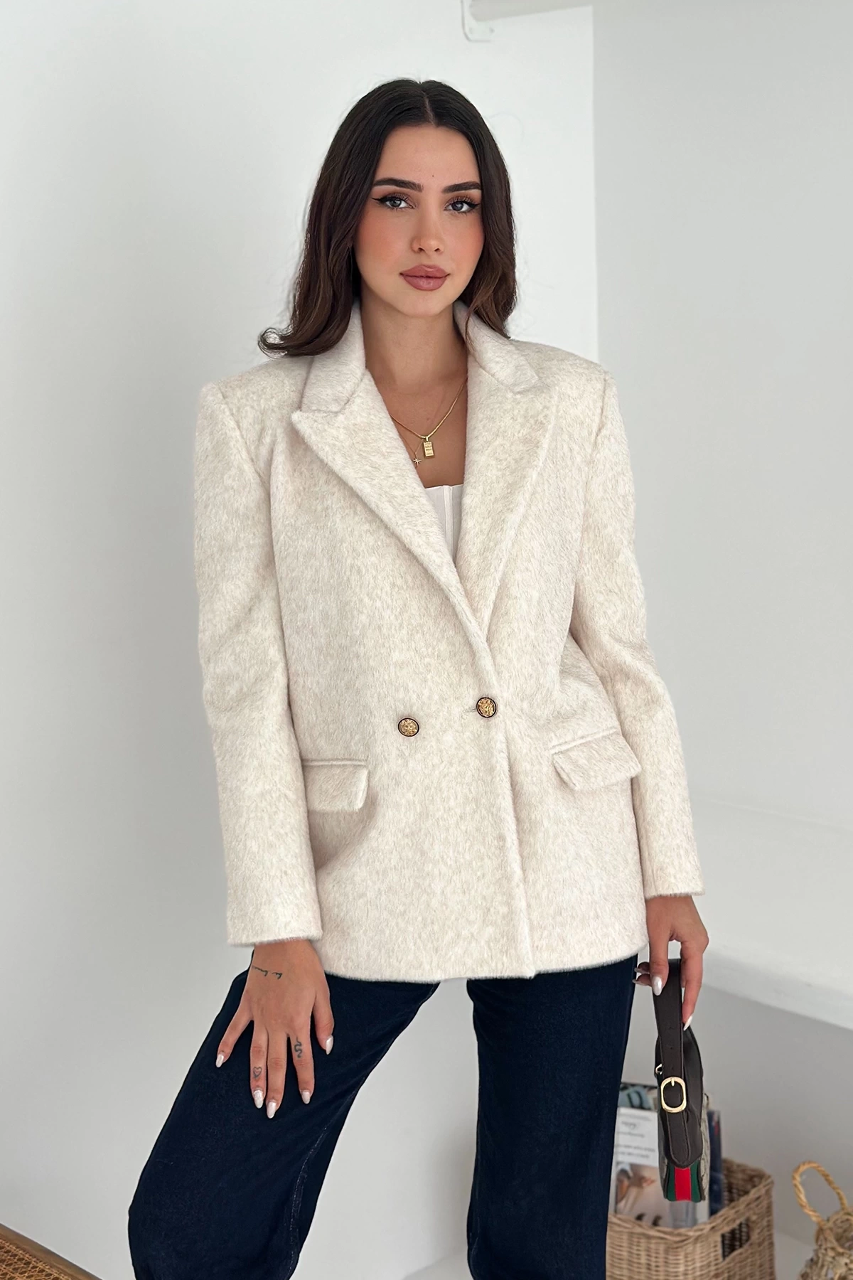 Beyazın asil duruşu ile birleşen modern kesimi, her kombine kolayca uyum sağlar ve zarif bir görünüm kazandırır.