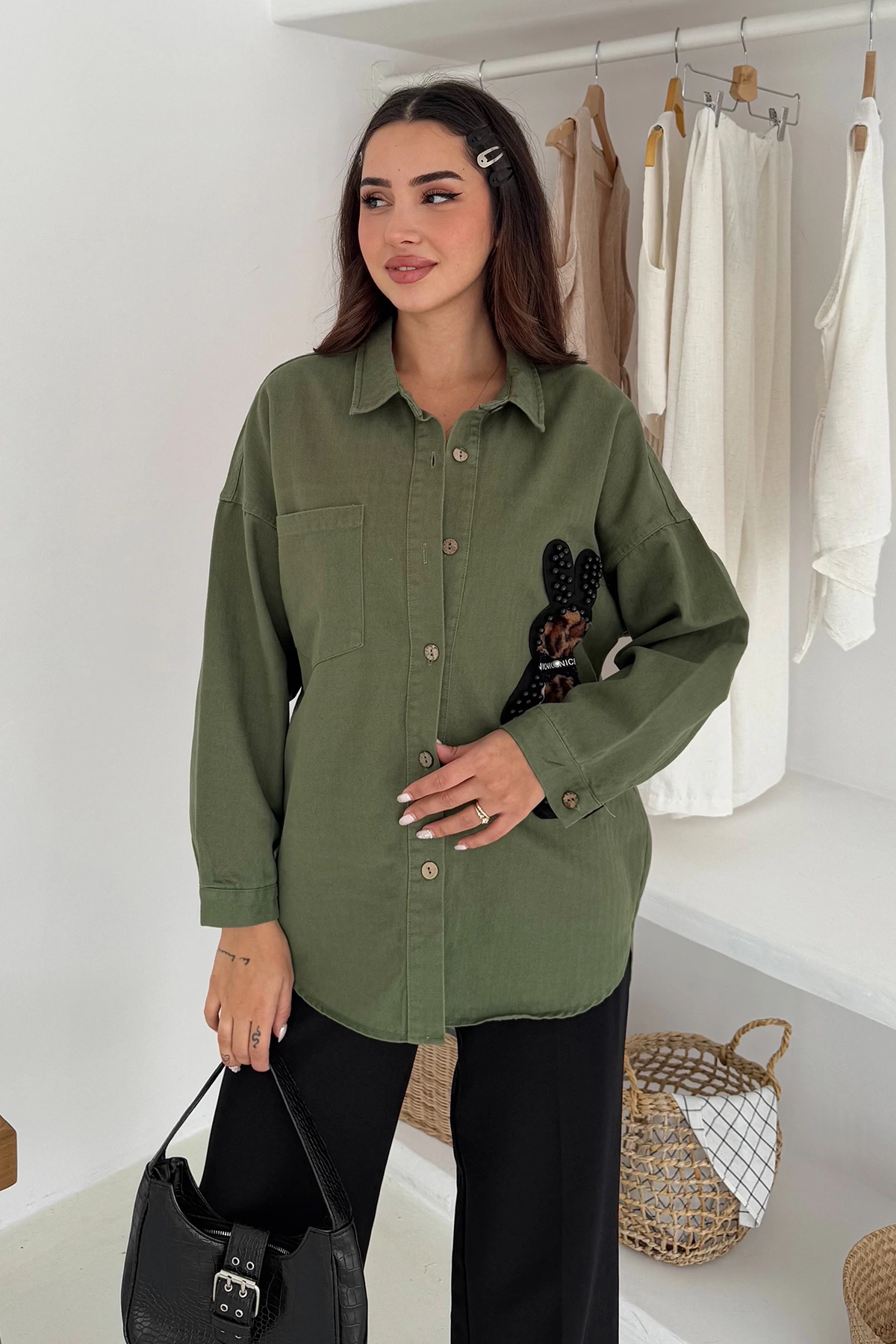 Haki rengi ile her kombine uyum sağlayan bu gömlek, oversize veya klasik kesim fark etmeksizin şık ve modern bir görünüm sunar. Günlük stilinizi özgünleştirmek için mükemmel bir tercih!