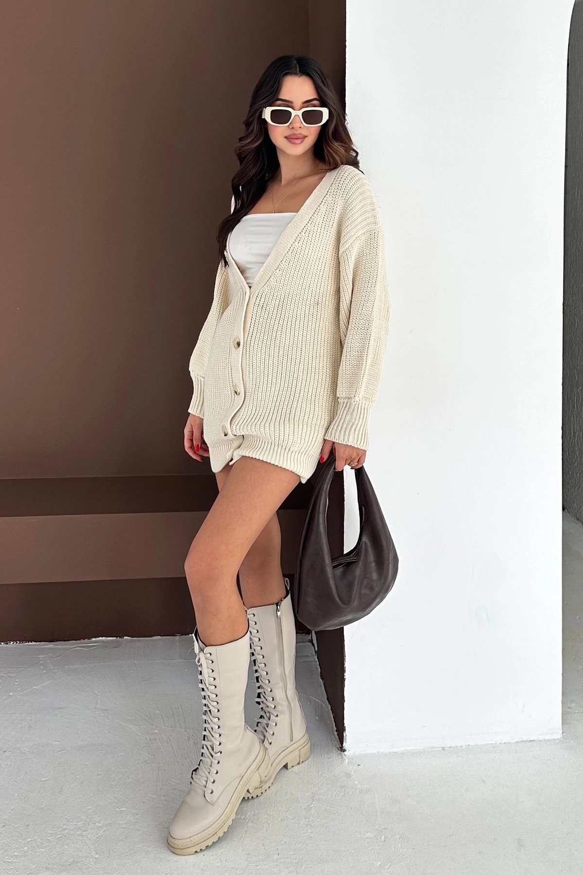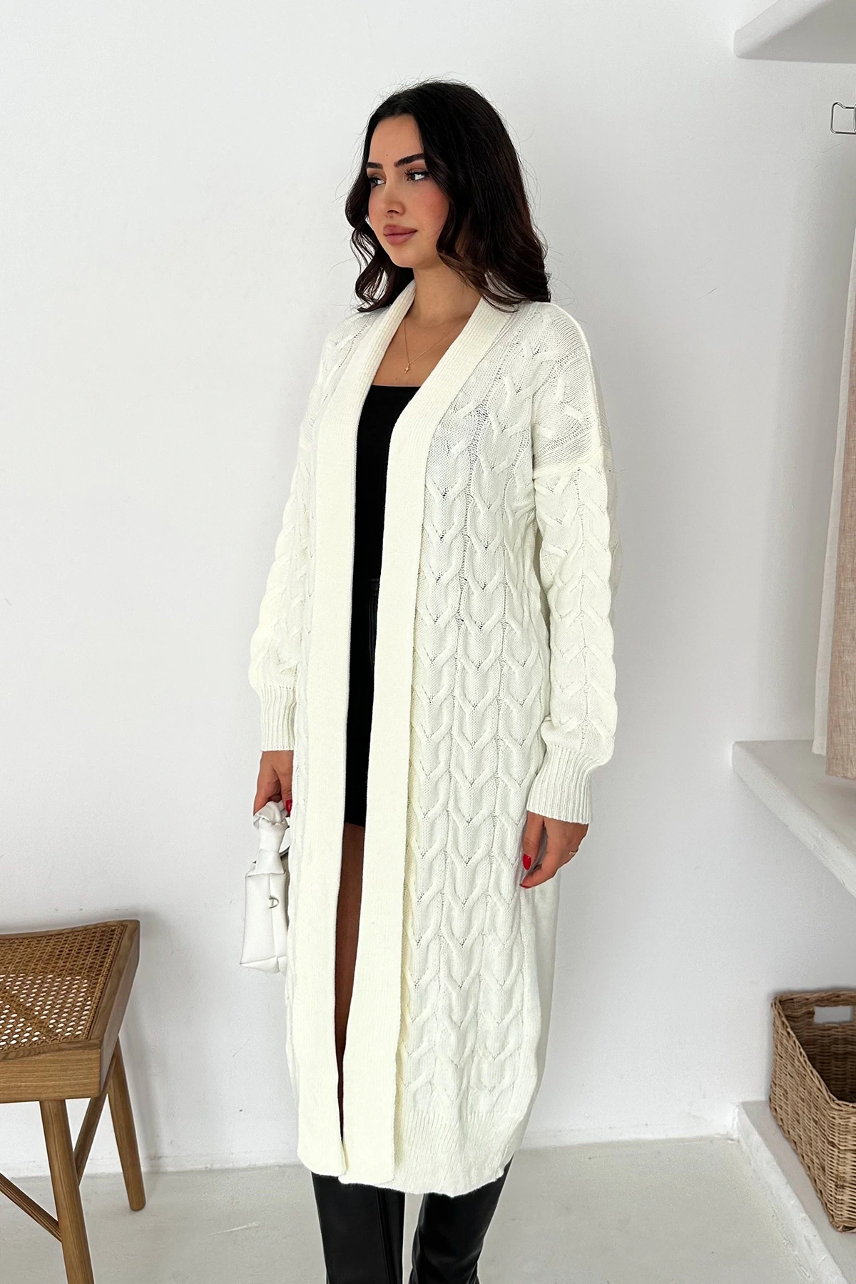 Örgü Detaylı Uzun Triko Hırka Beyaz