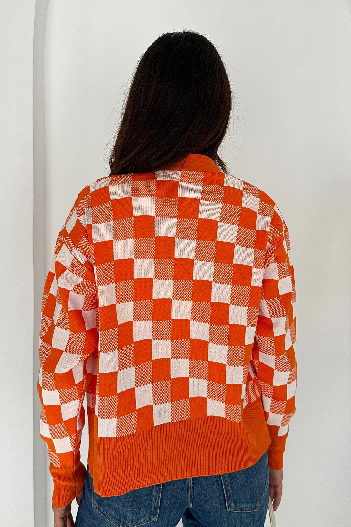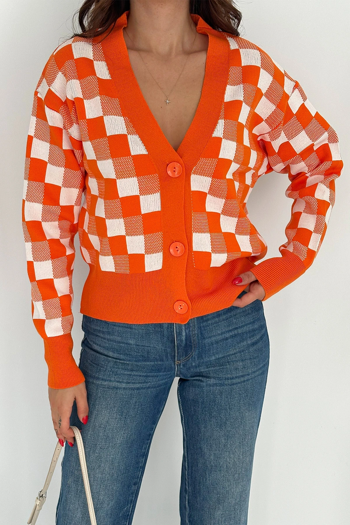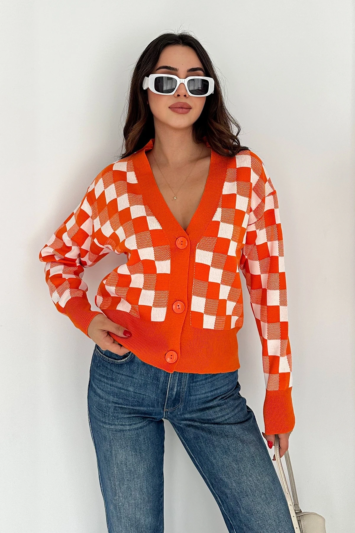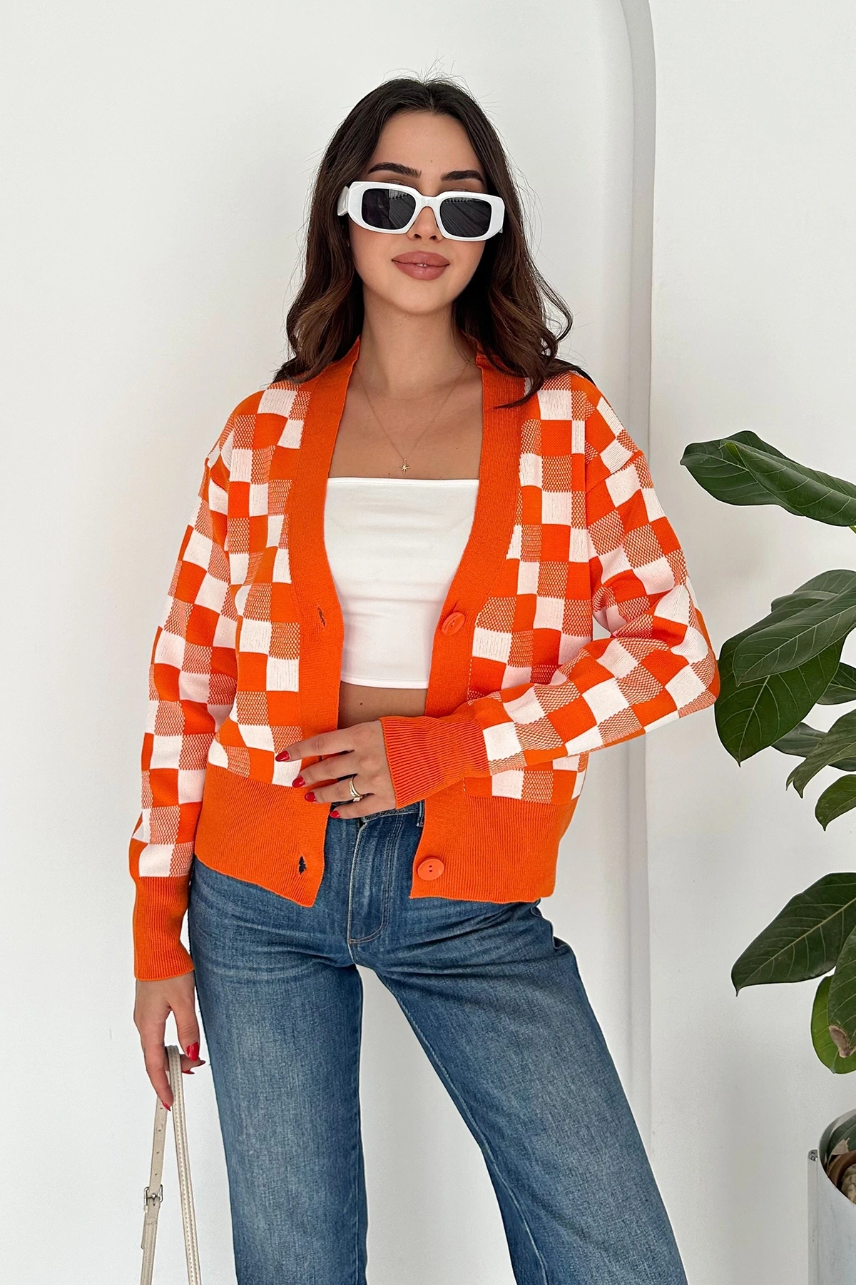 Uzun Kollu Çiçek Desenli Triko Hırka Turuncu