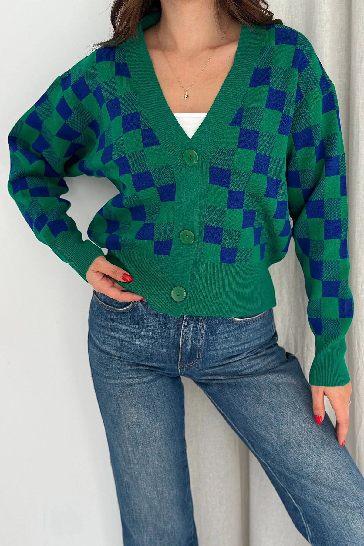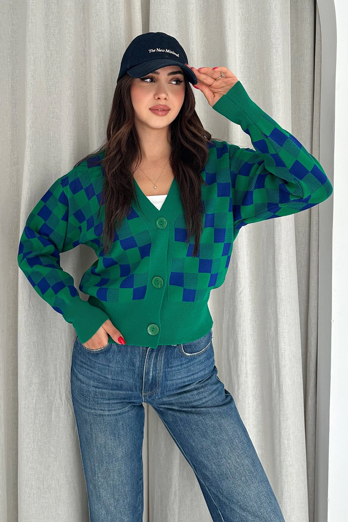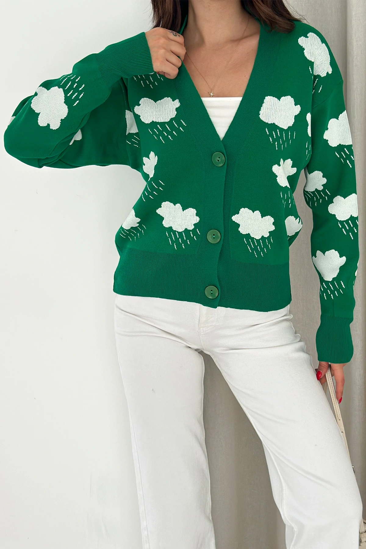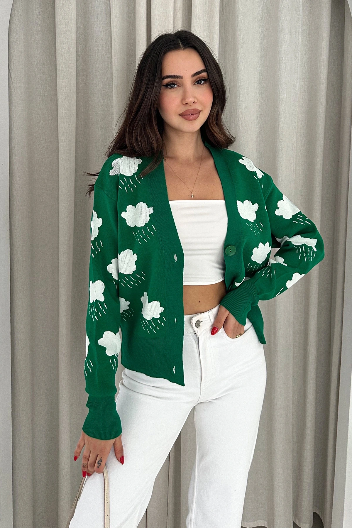 Uzun Kollu Çiçek Desenli Triko Hırka Yeşil