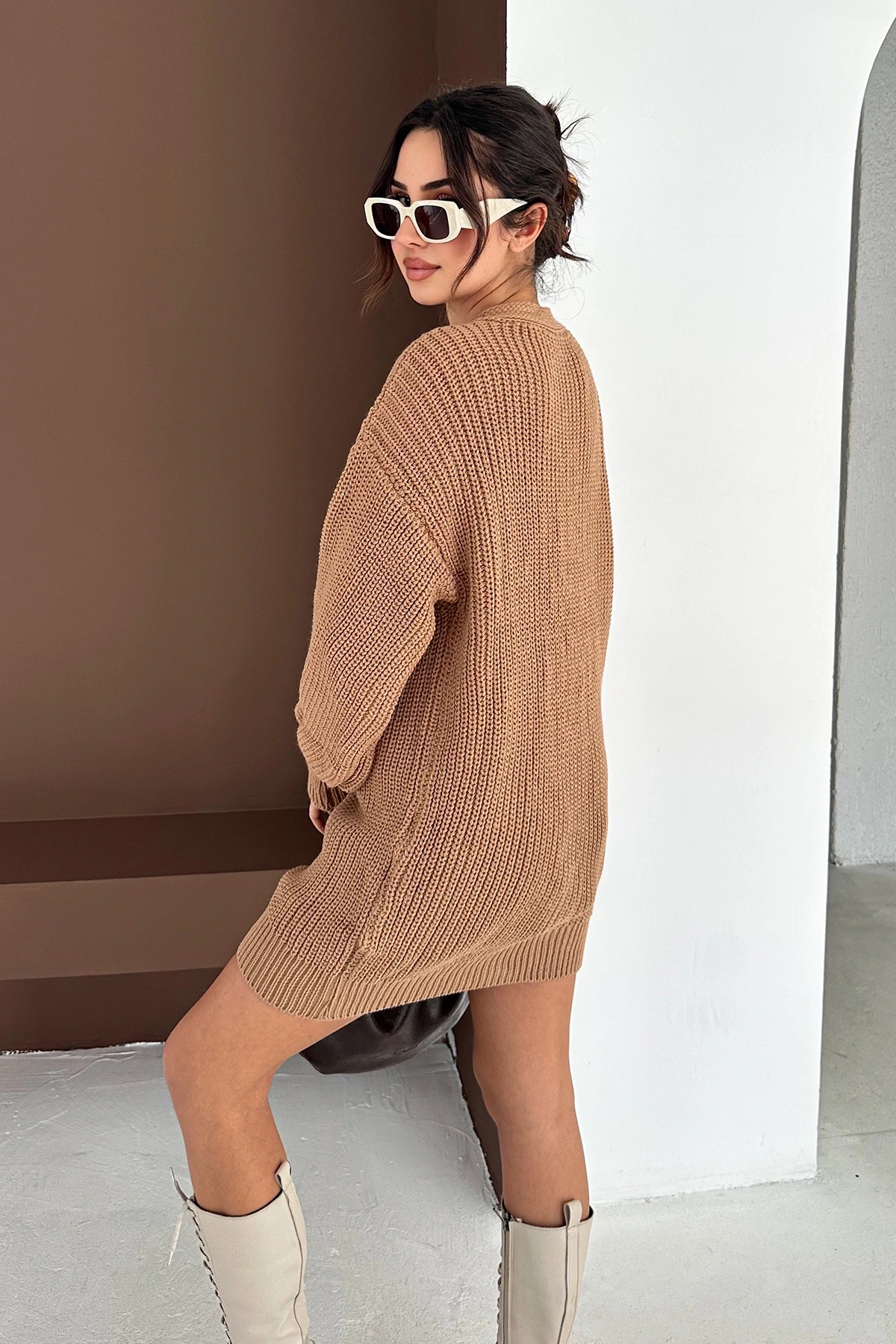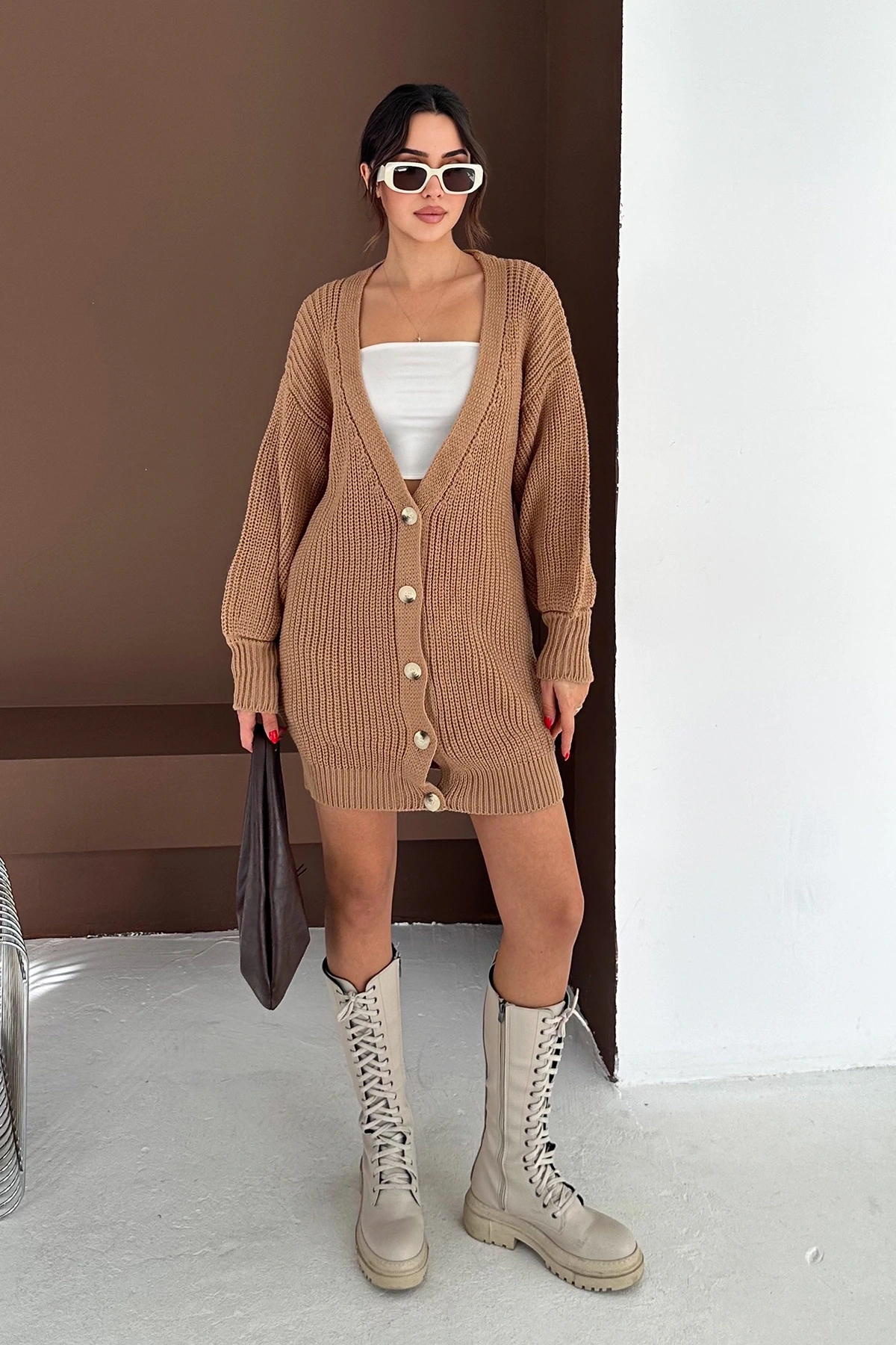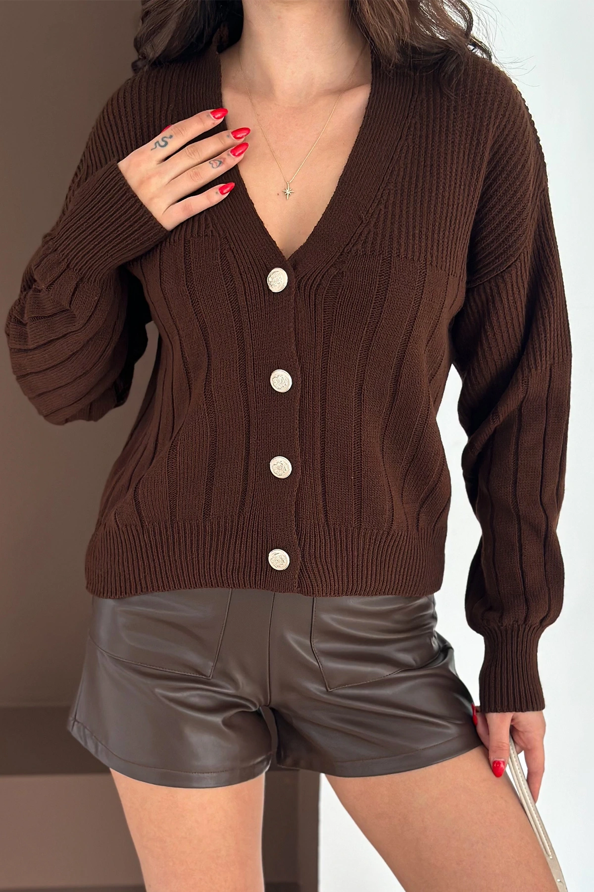Selanik Örgü Cep Detaylı Uzun Triko Hırka Kahverengi