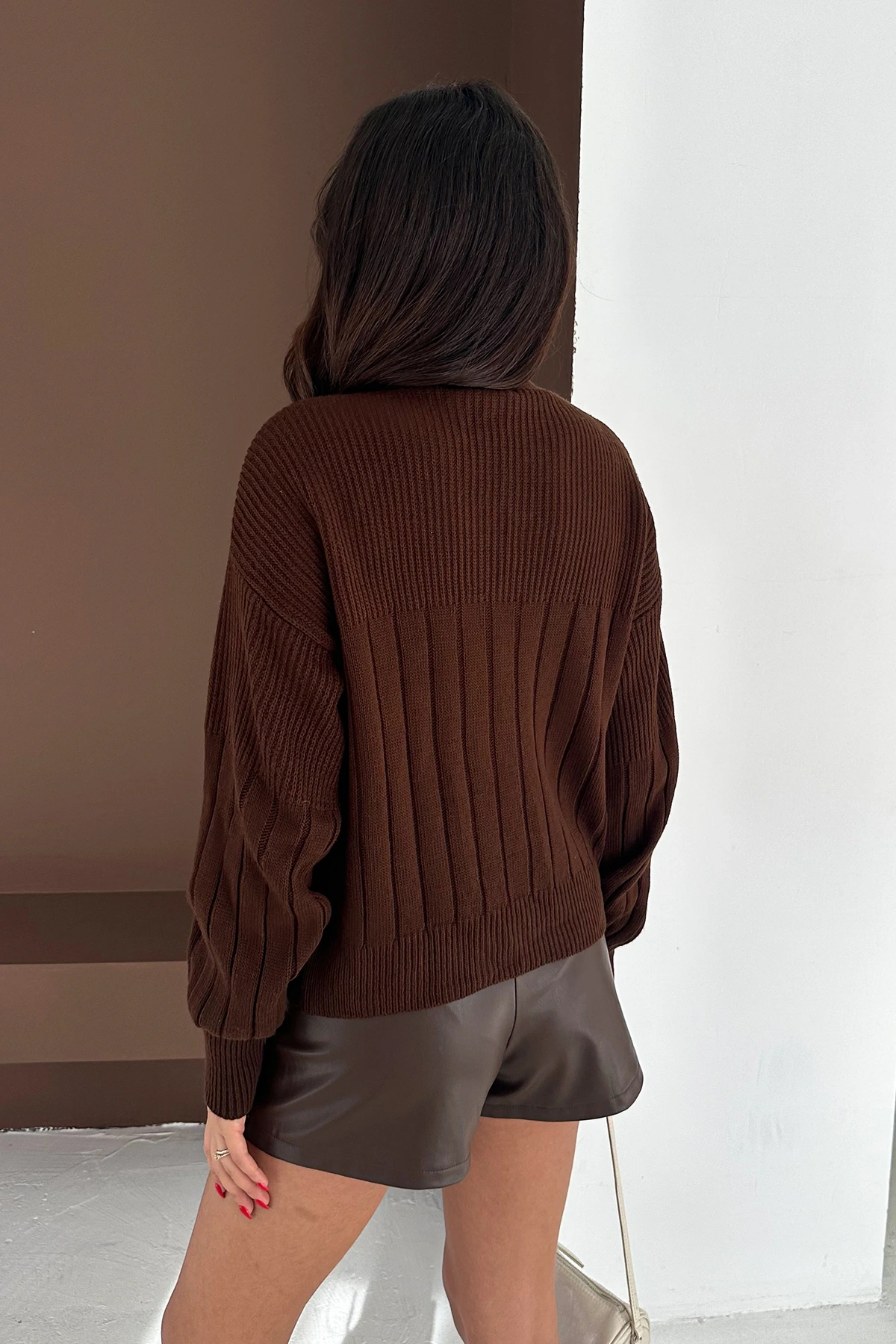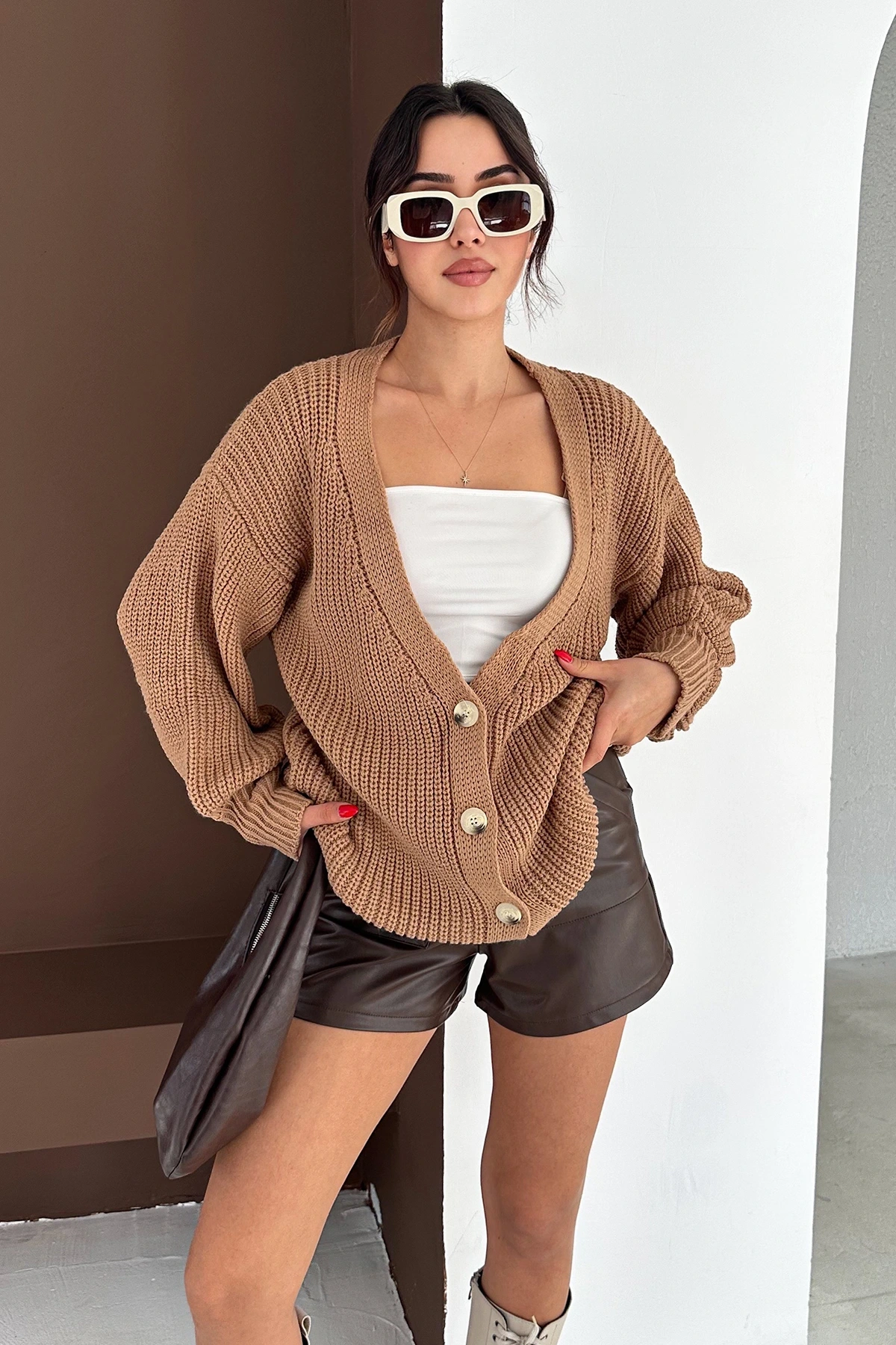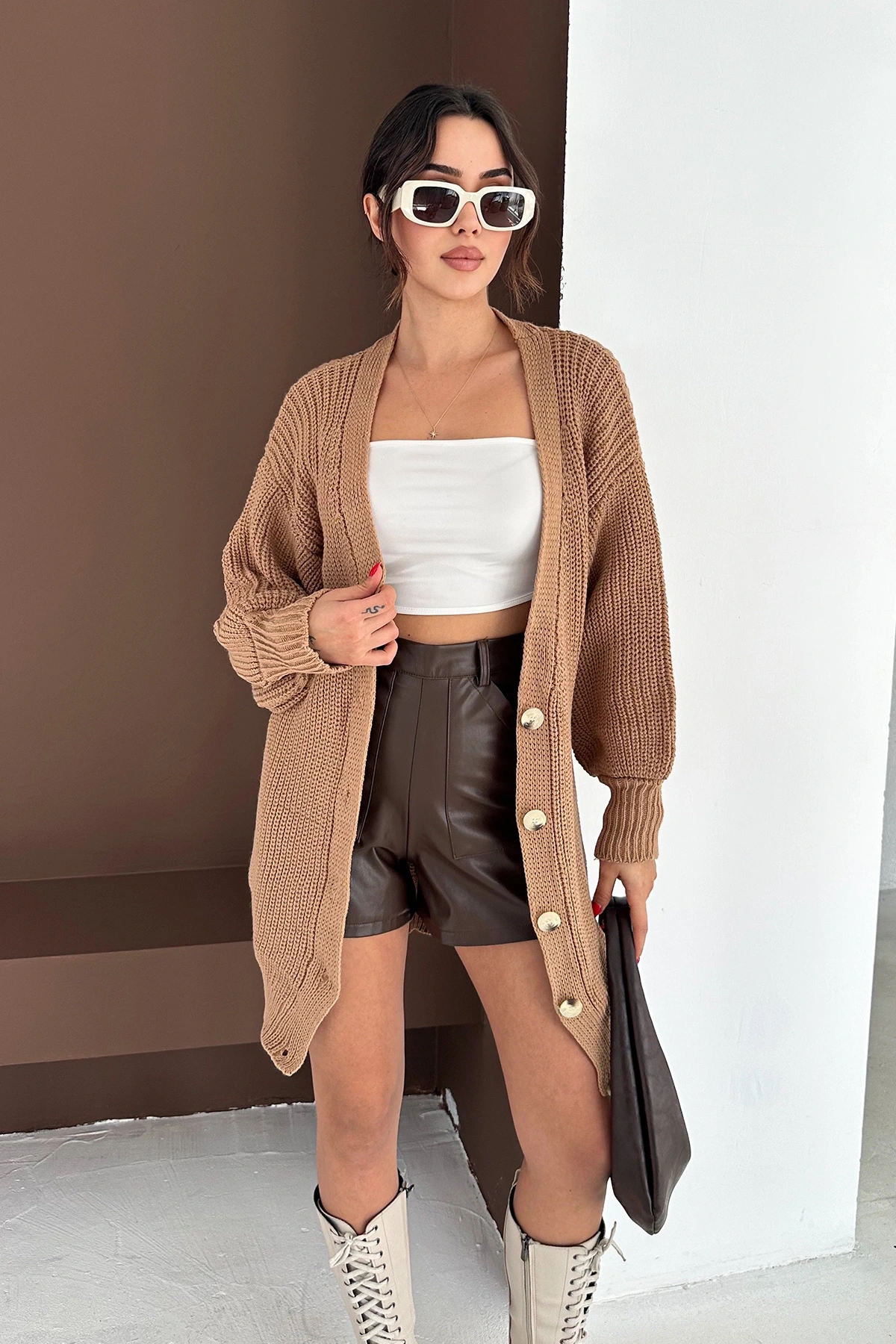 Selanik Örgü Cep Detaylı Uzun Triko Hırka Kahverengi