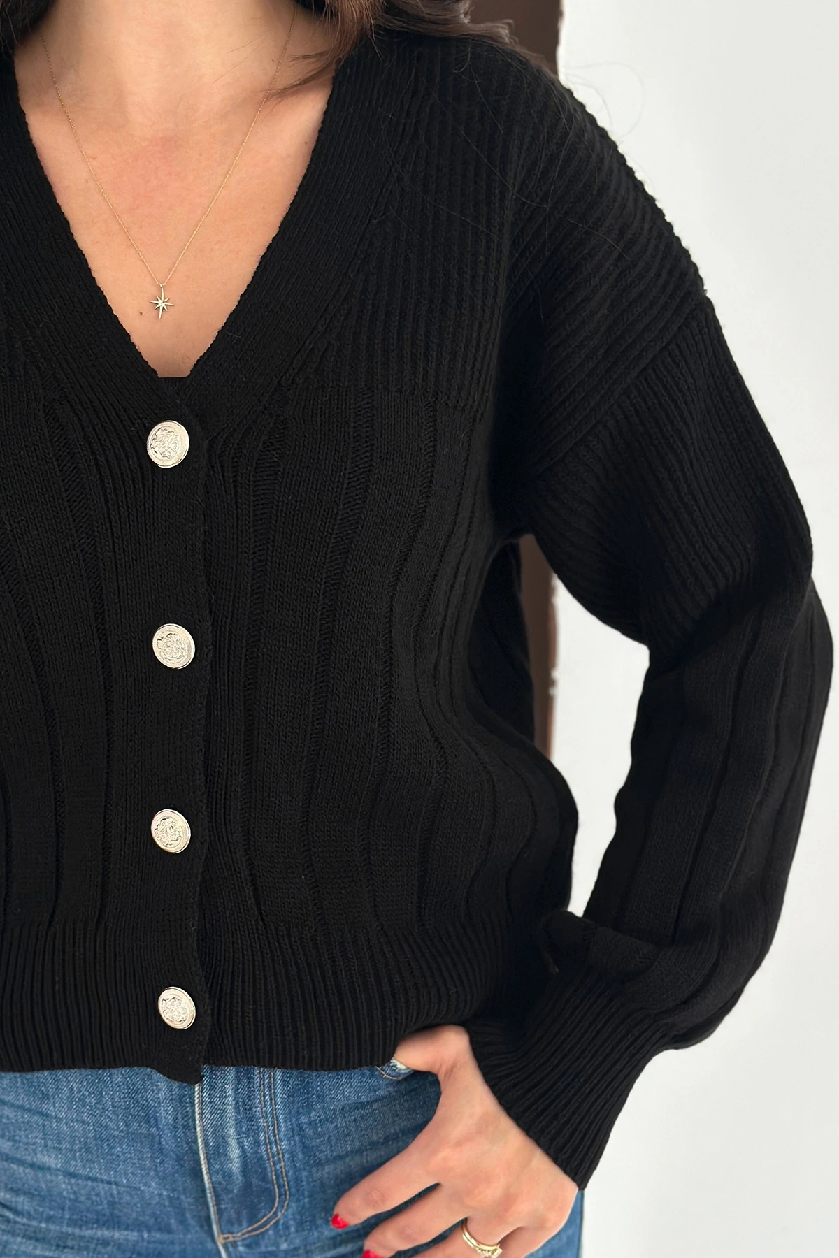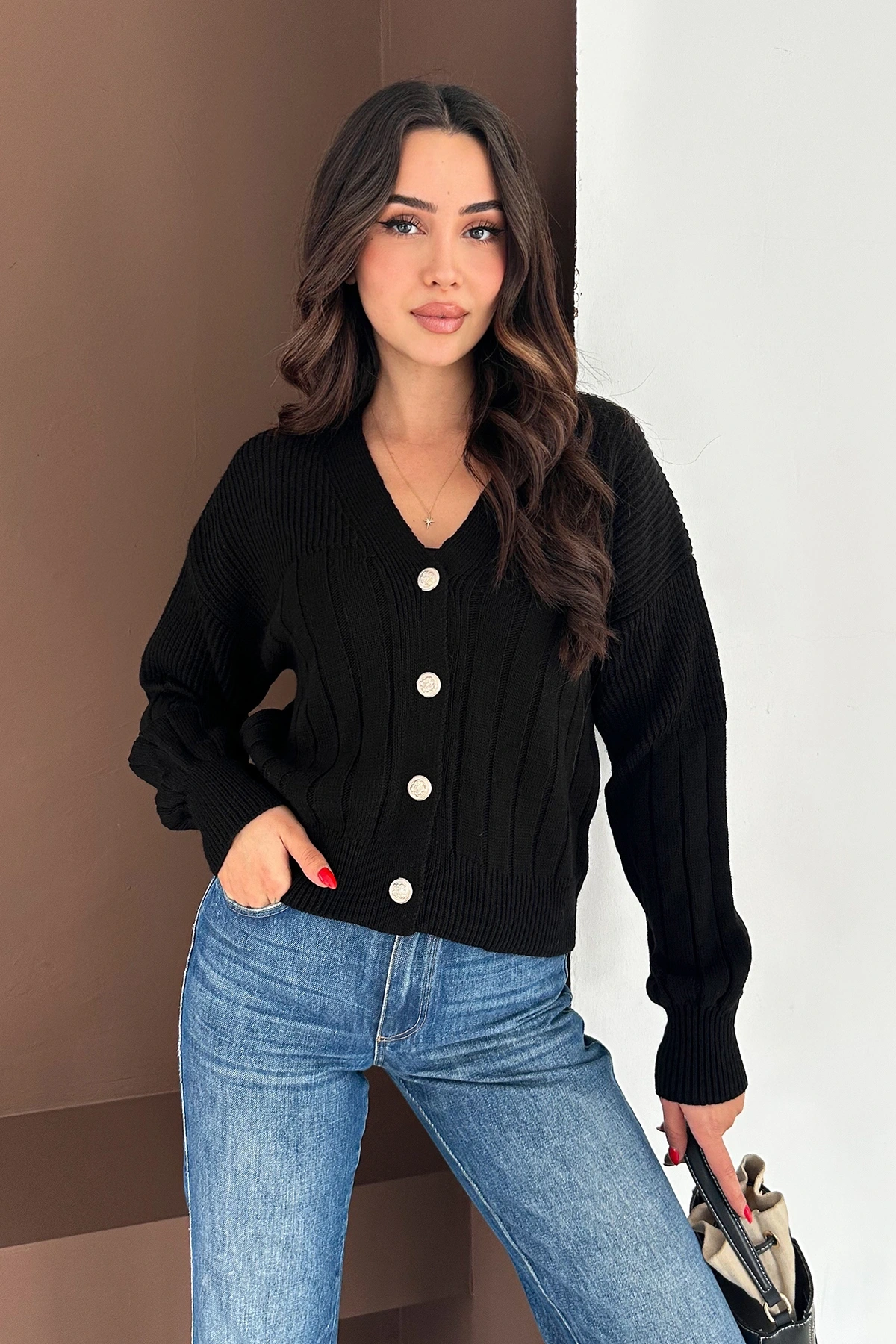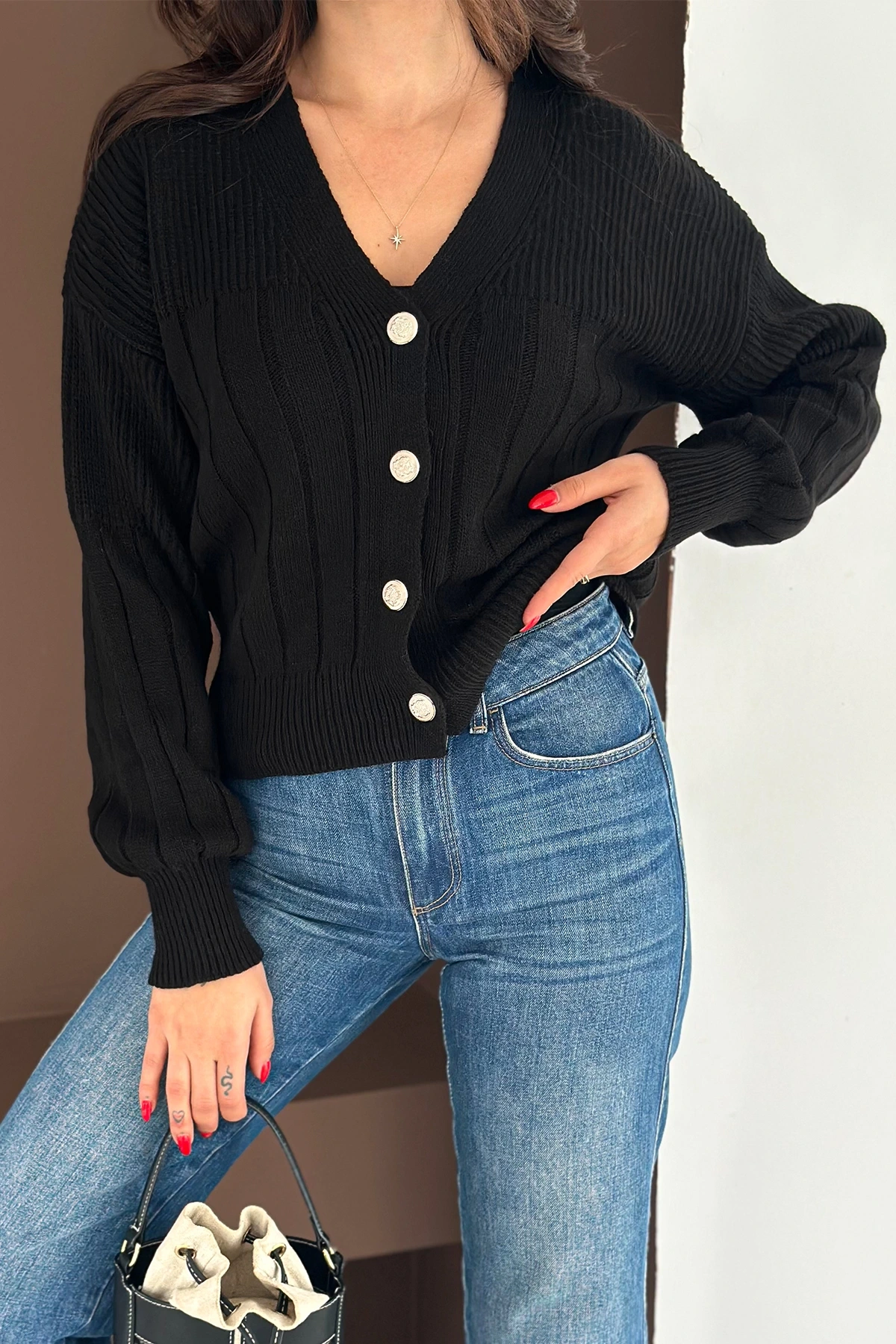 Örgü Detaylı Uzun Triko Hırka Siyah