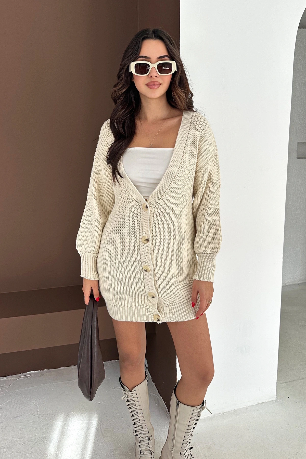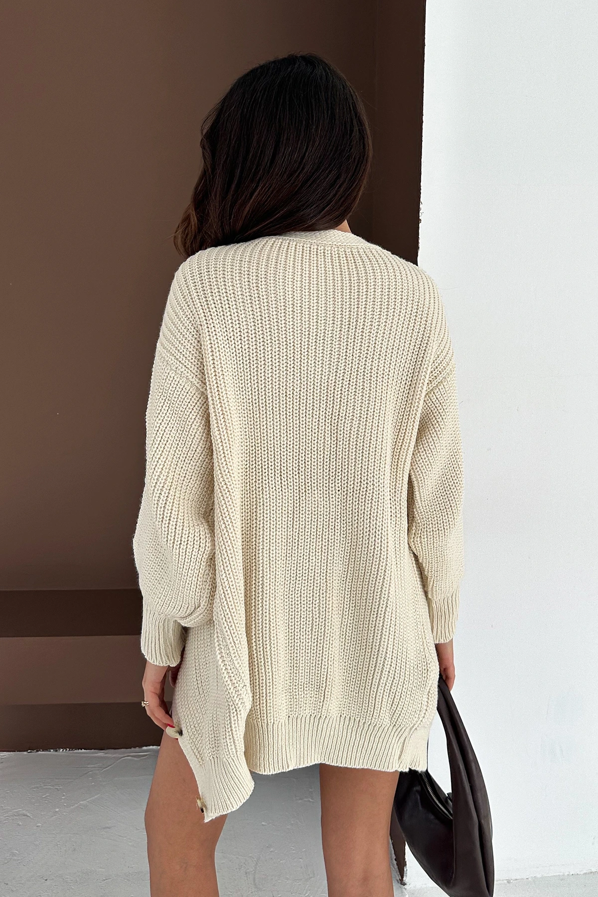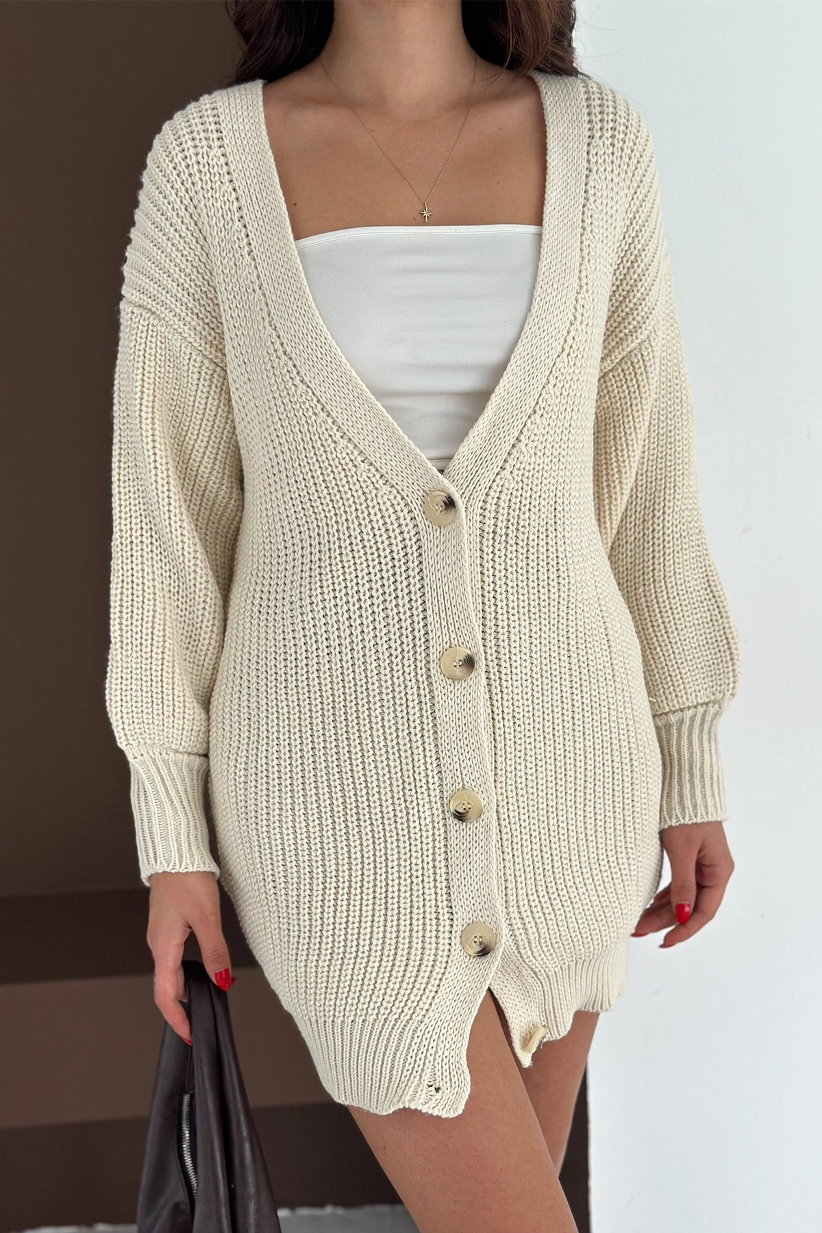 Selanik Örgü Cep Detaylı Uzun Triko Hırka Beyaz