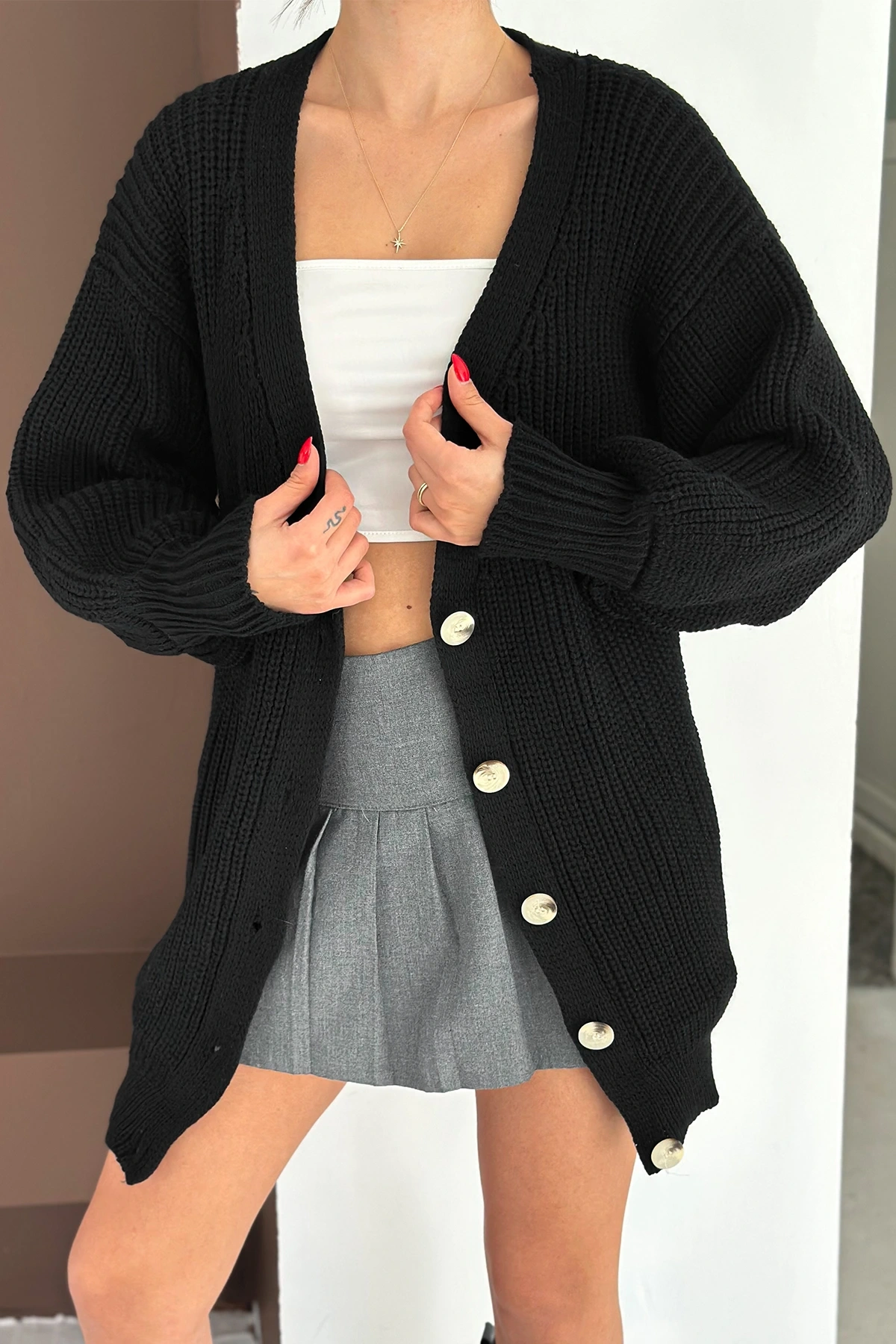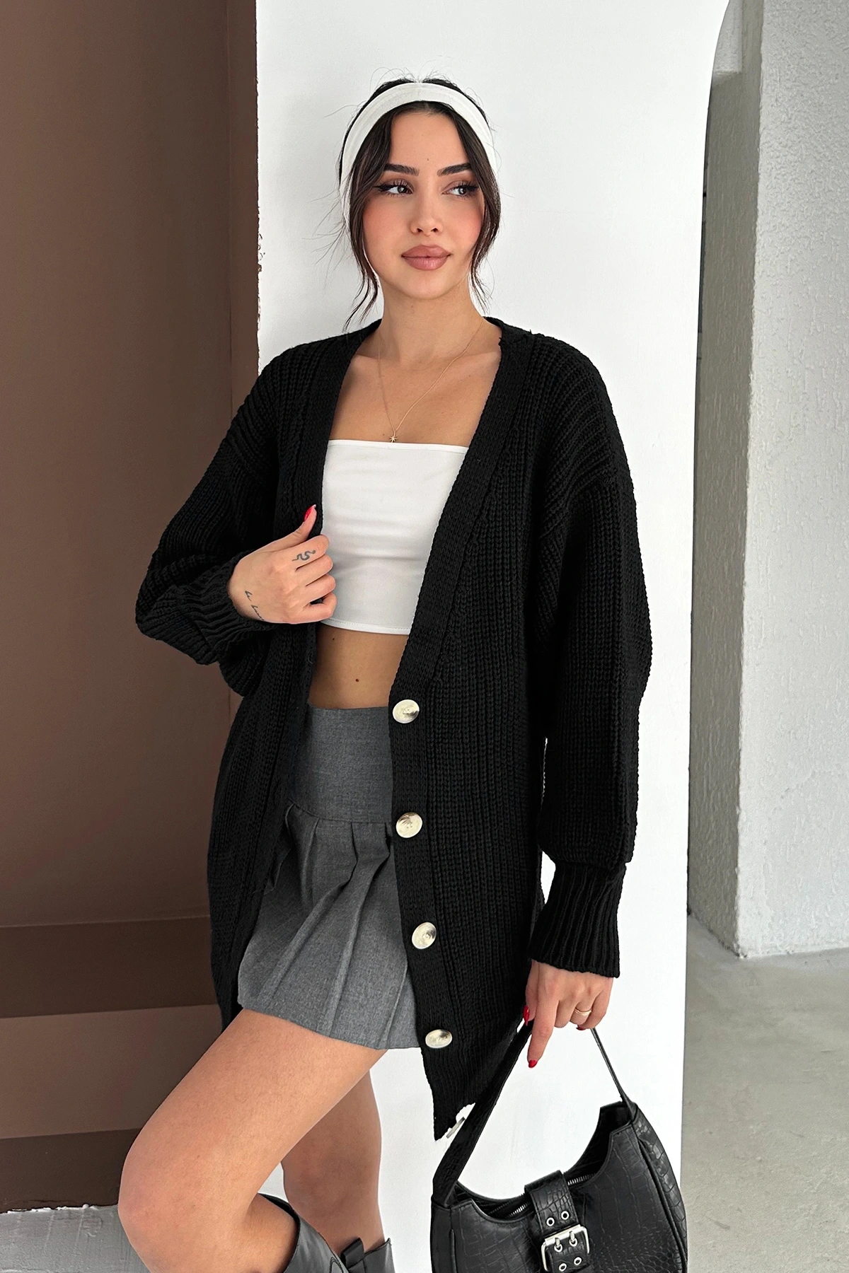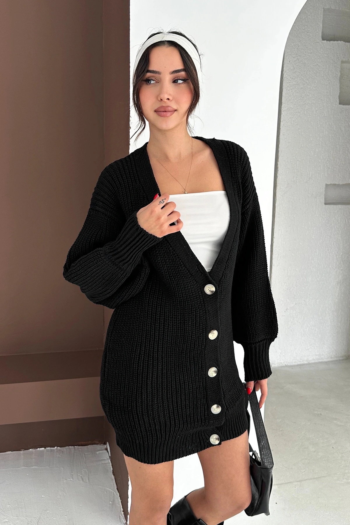 Selanik Örgü Cep Detaylı Uzun Triko Hırka Siyah