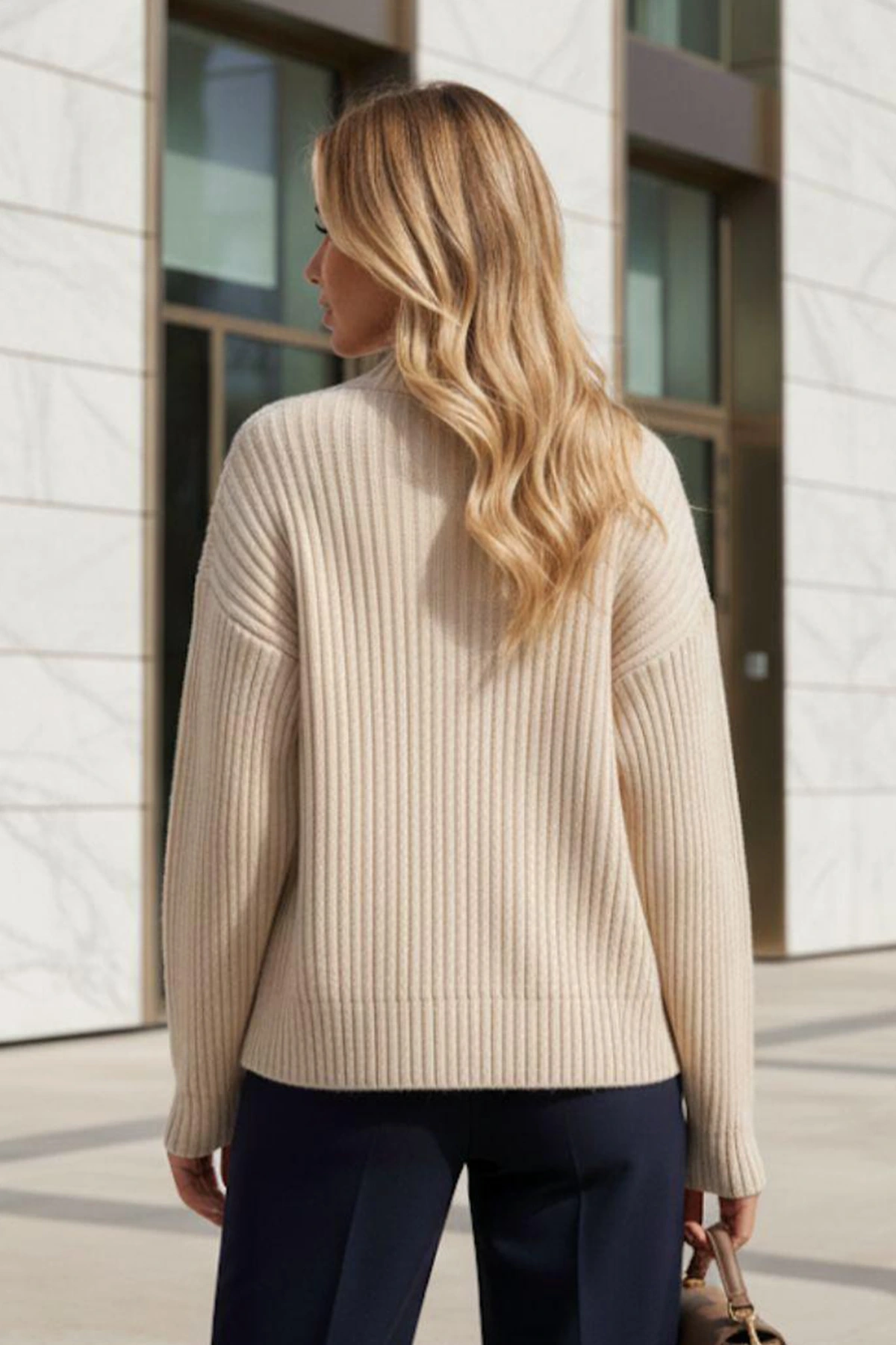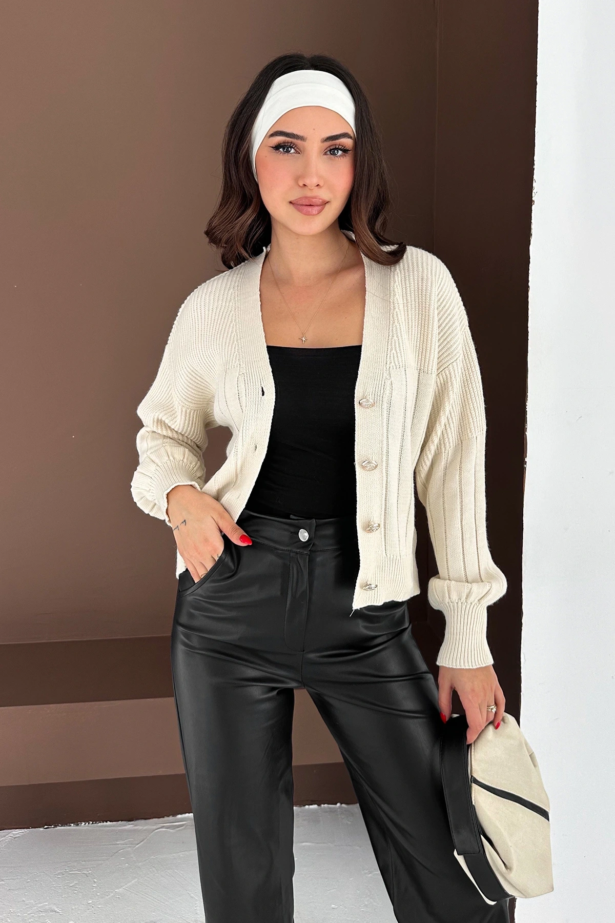 Selanik Örgü Cep Detaylı Uzun Triko Hırka Beyaz