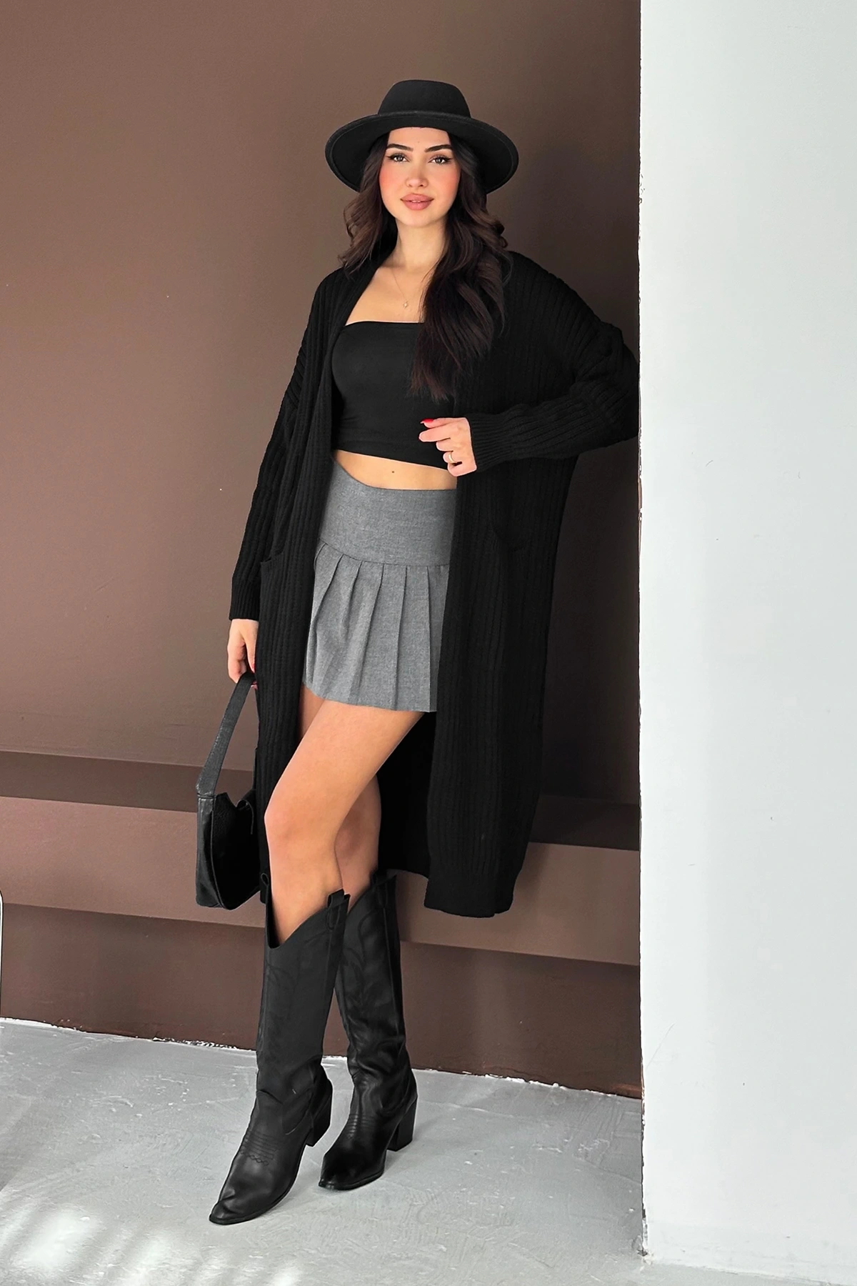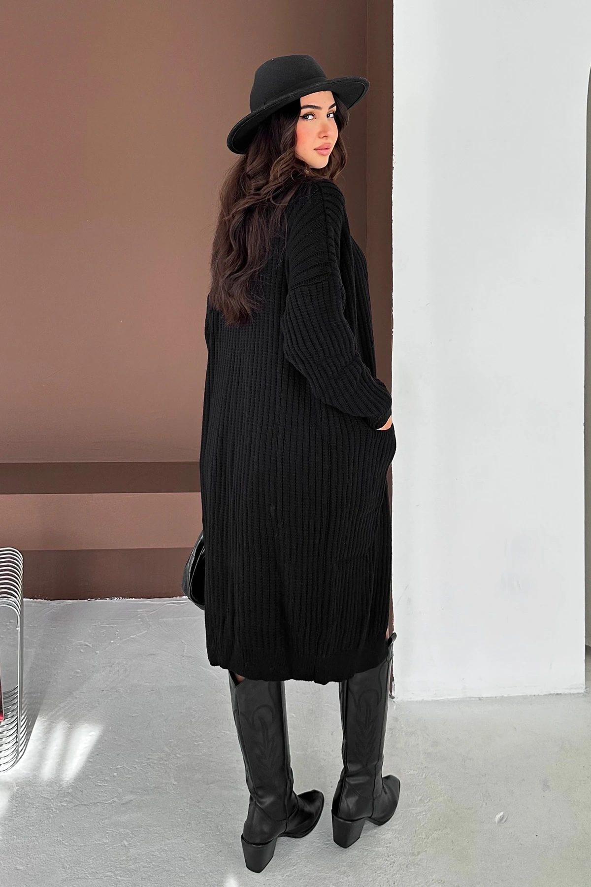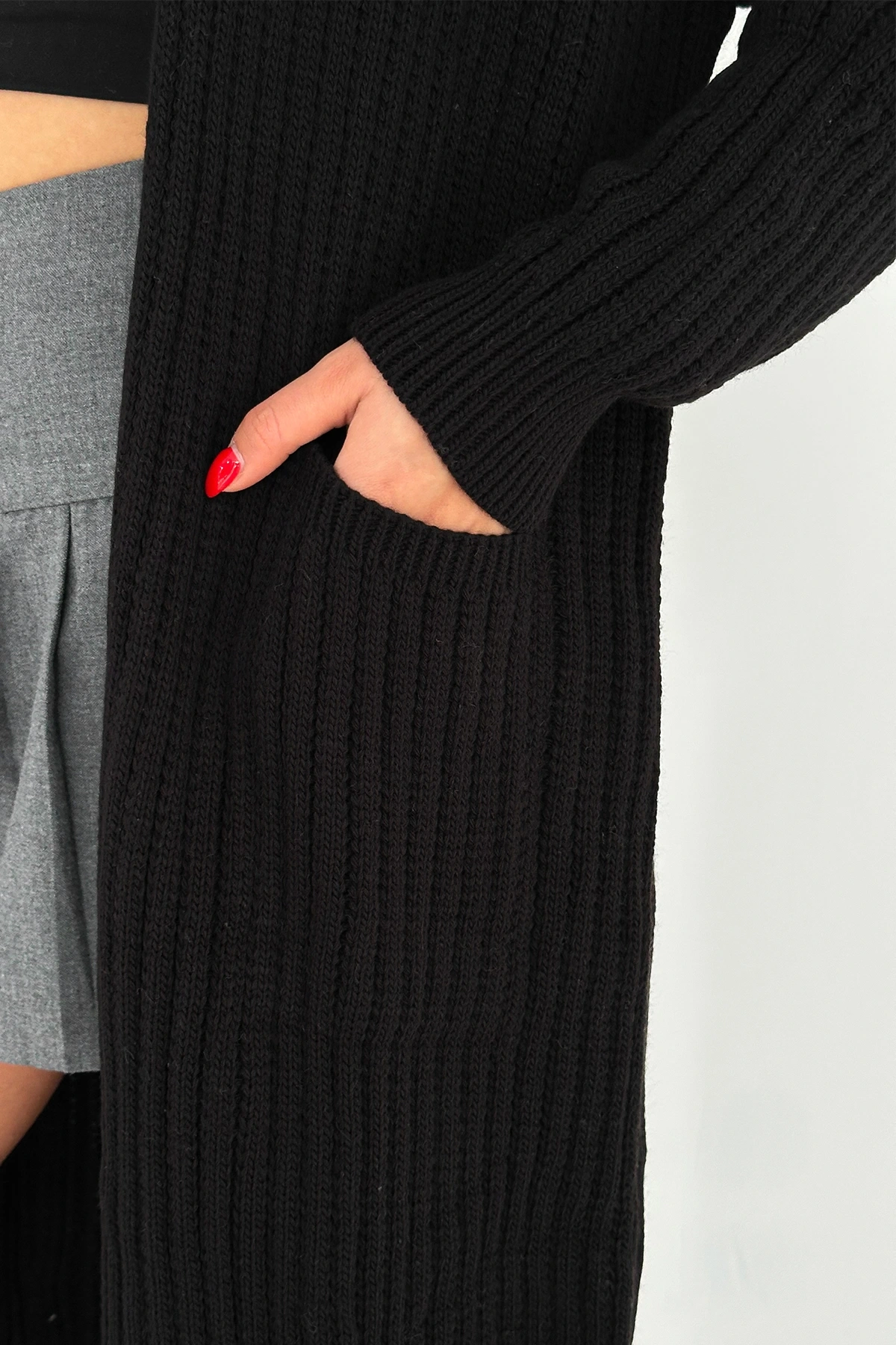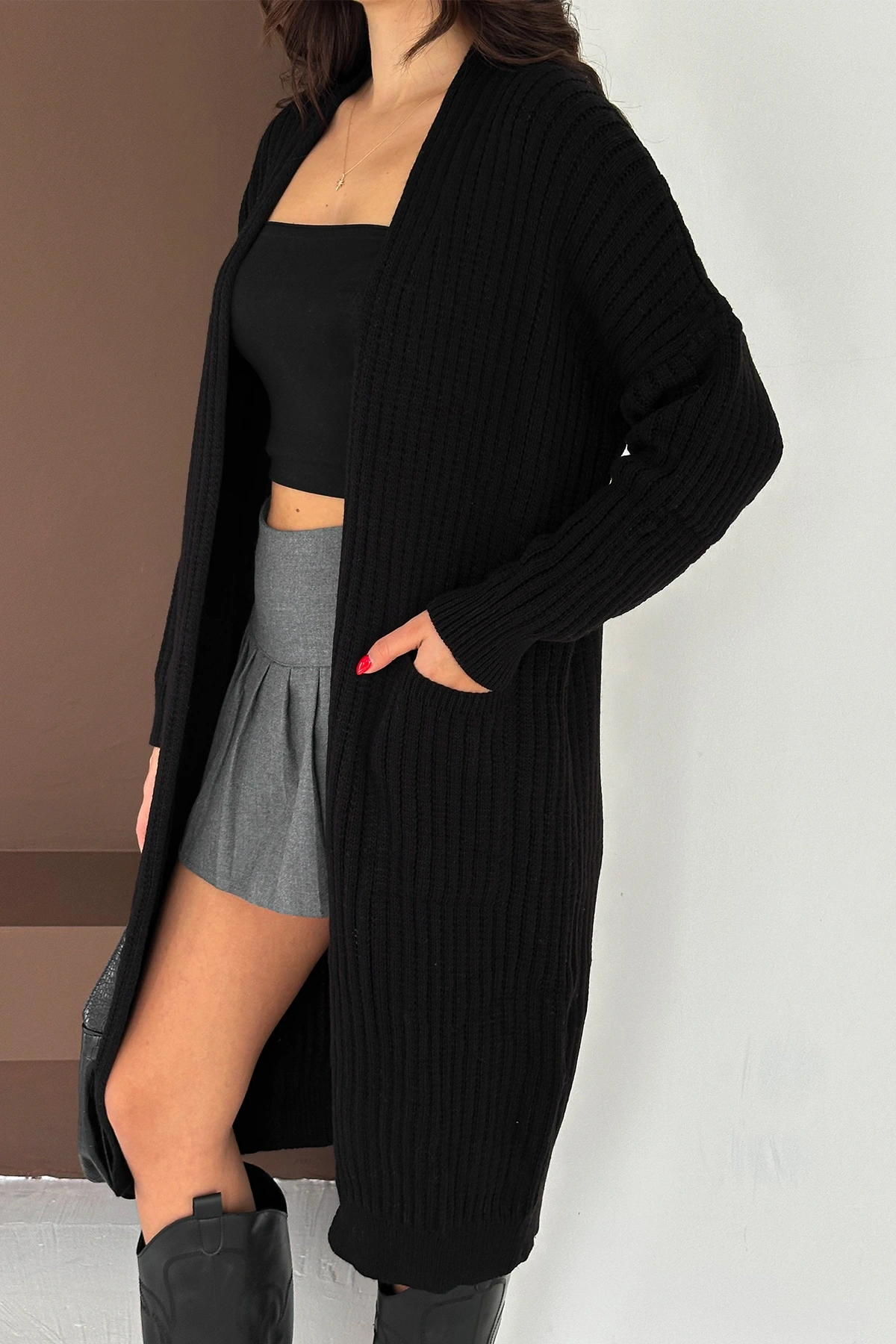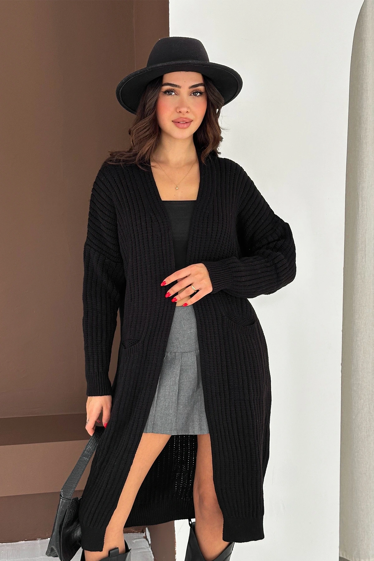 Selanik Örgü Cep Detaylı Uzun Triko Hırka Siyah