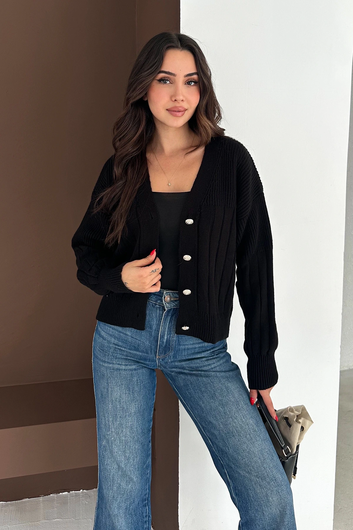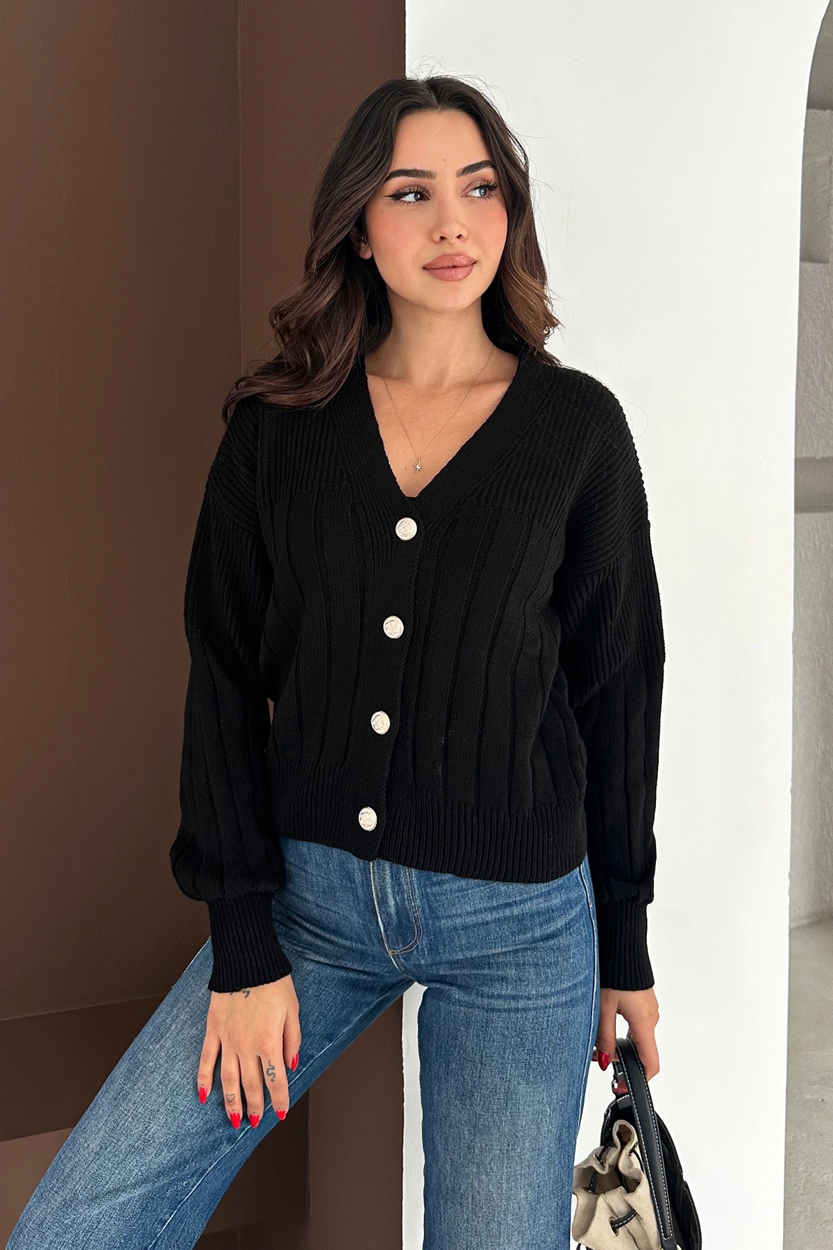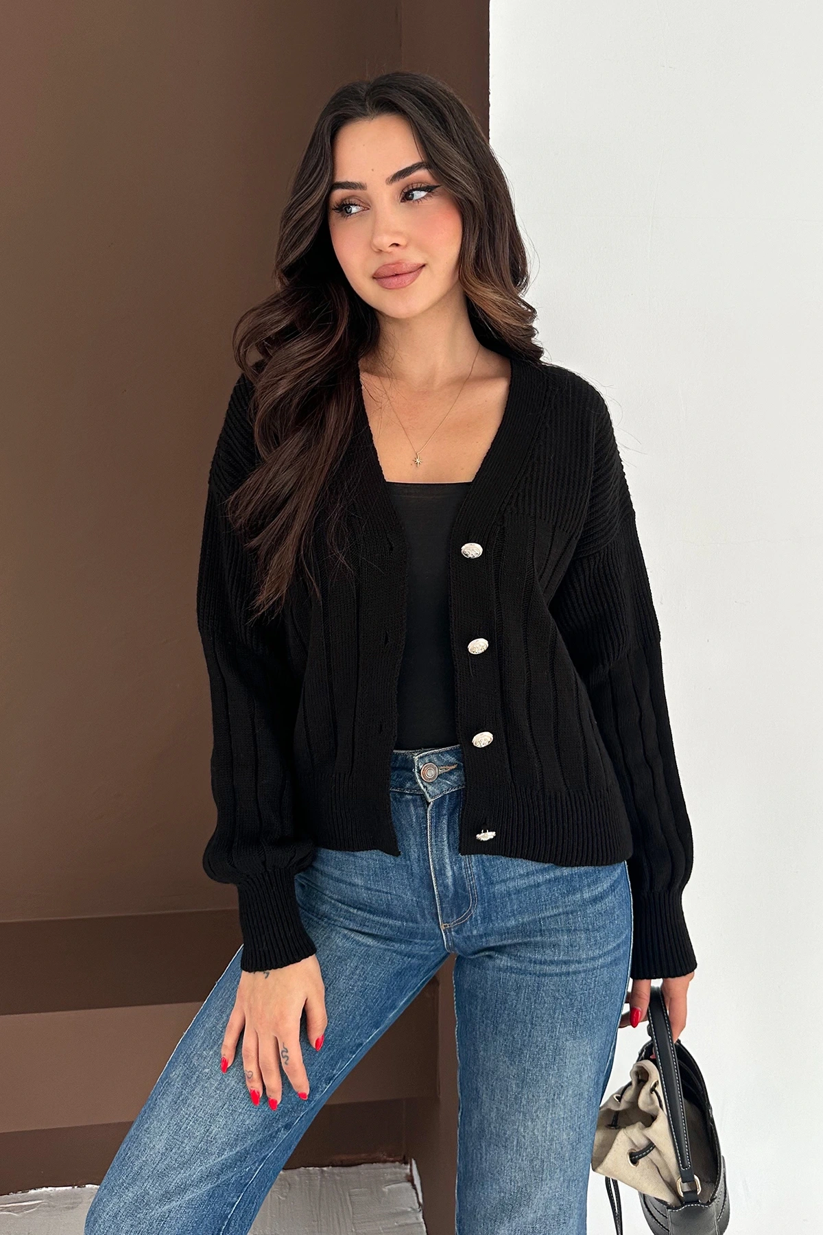 Örgü Detaylı Uzun Triko Hırka Siyah