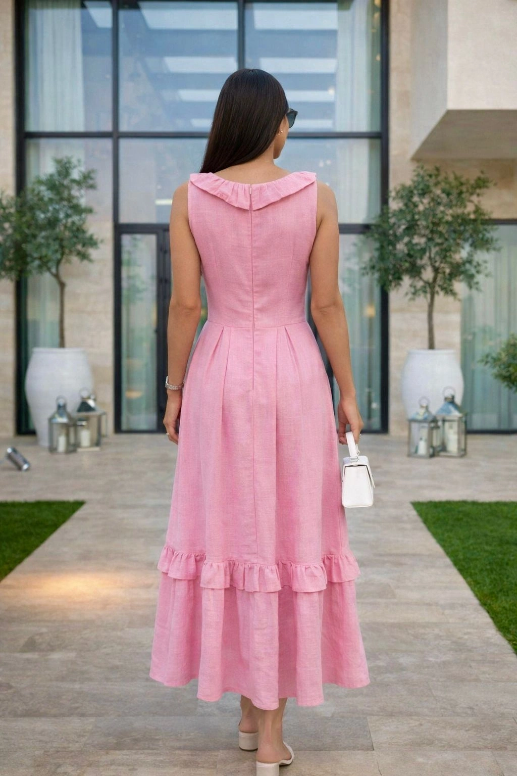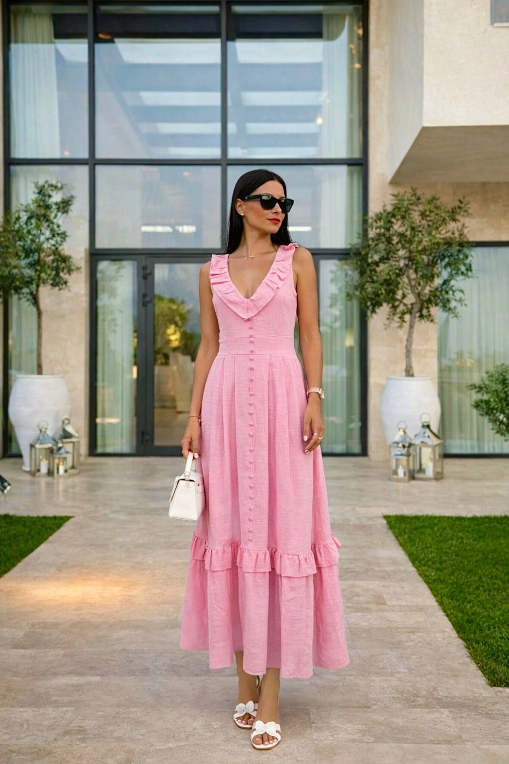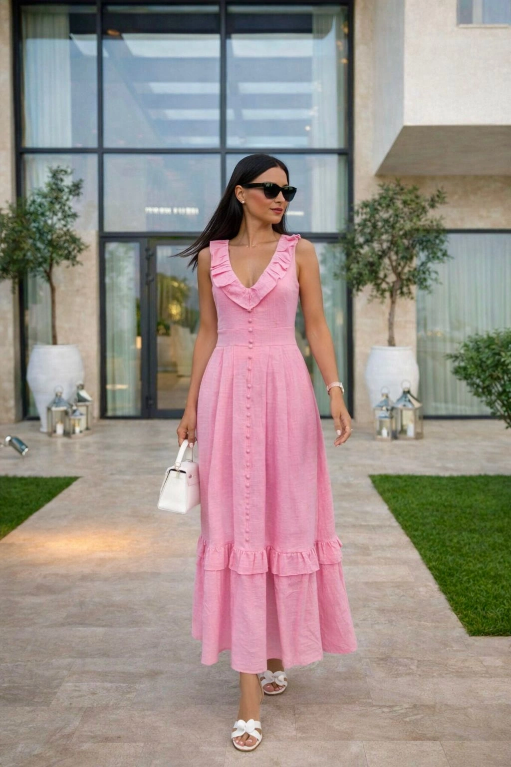 V Yaka Önü Süs Düğmeli Keten Elbise